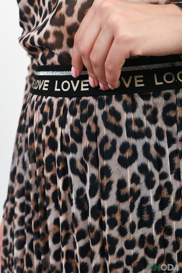 Модель имеет плиссированную юбку, которая придает ей легкость и воздушность. Эластичный пояс обеспечивает комфортную посадку по фигуре и украшен надписью "LOVE".