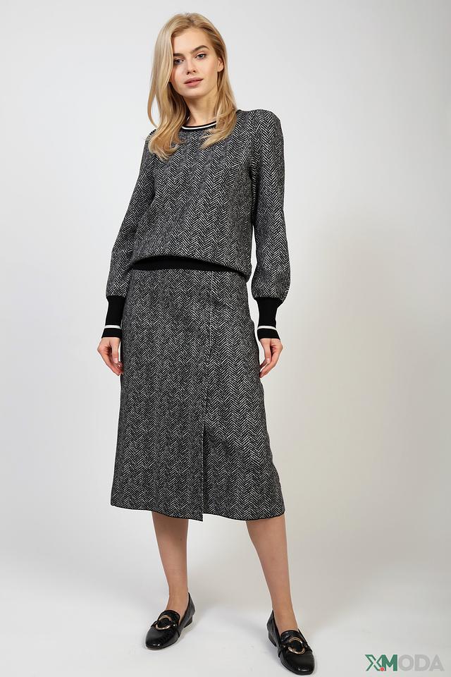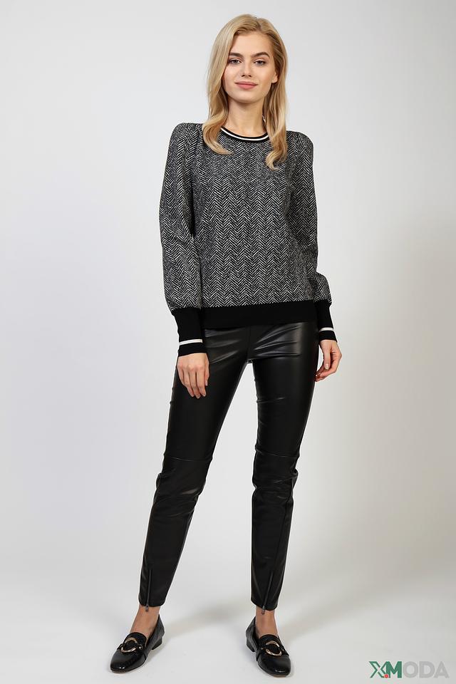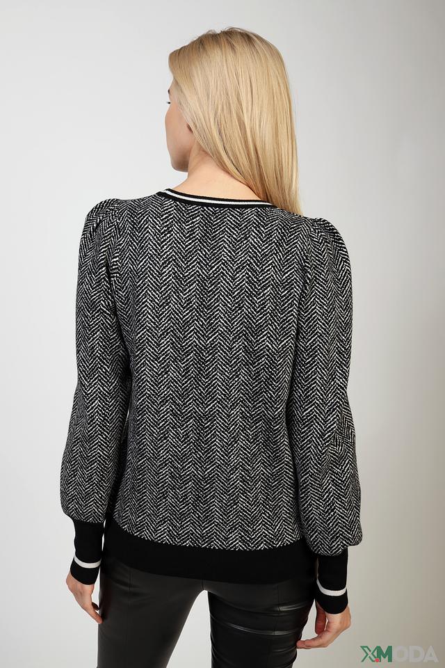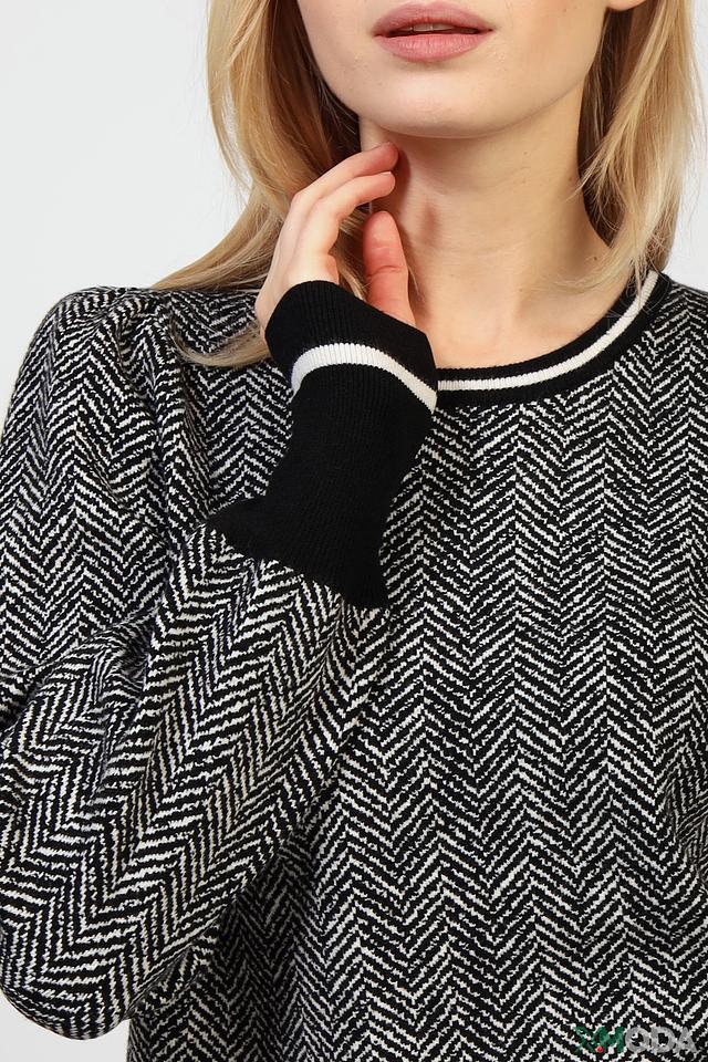 Пуловер имеет классический круглый вырез горловины и длинные рукава с манжетами. Отличительной особенностью модели является узор "елочка", выполненный в чёрно-белой гамме, который придает изделию элегантность и изысканность.
