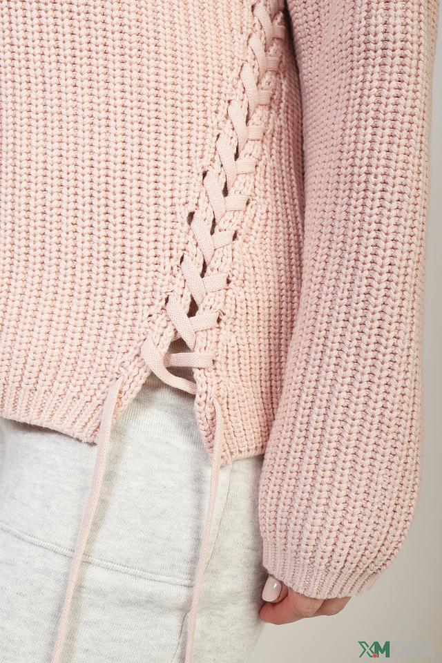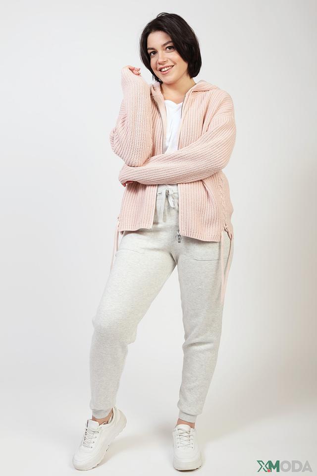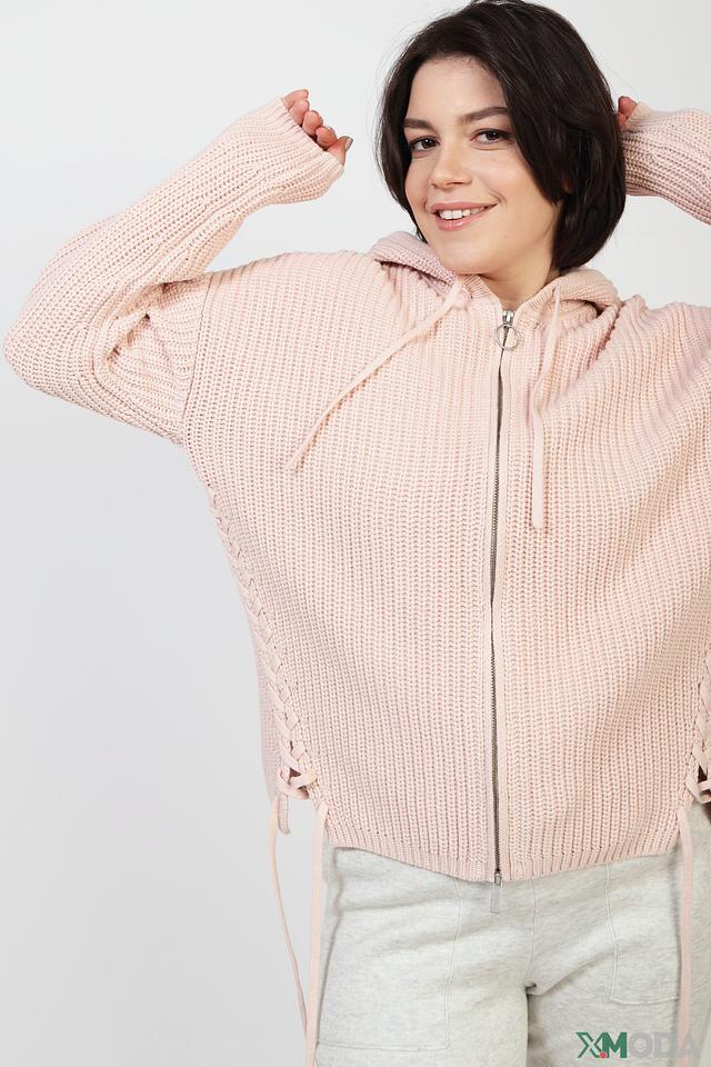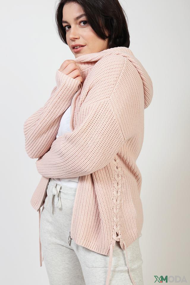 Жакет имеет удобный капюшон и застегивается на молнию. Боковые шнуровки позволяют регулировать силуэт и добавляют оригинальности. Модель выполнена из мягкого вязаного полотна, обеспечивающего комфорт в носке.