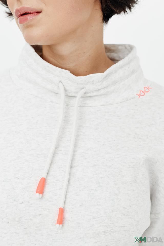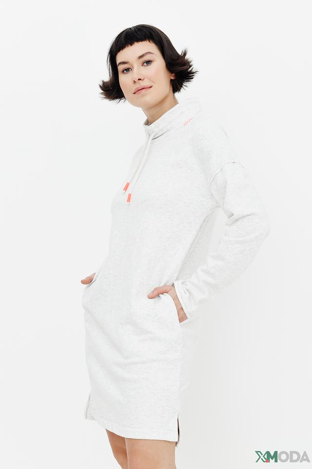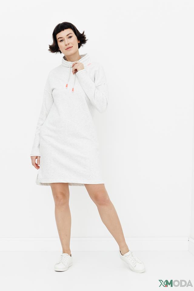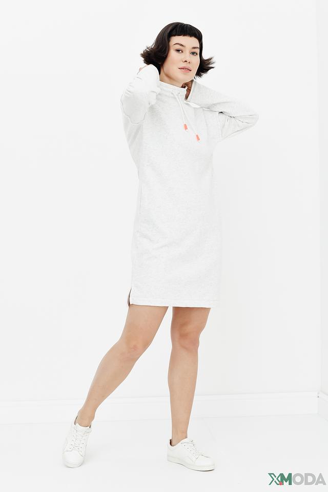 Платье имеет прямой силуэт, длину до колена и удобный капюшон. Дополнительный акцент – шнурки на капюшоне оранжевого цвета. Наличие боковых карманов делает модель более практичной и функциональной.