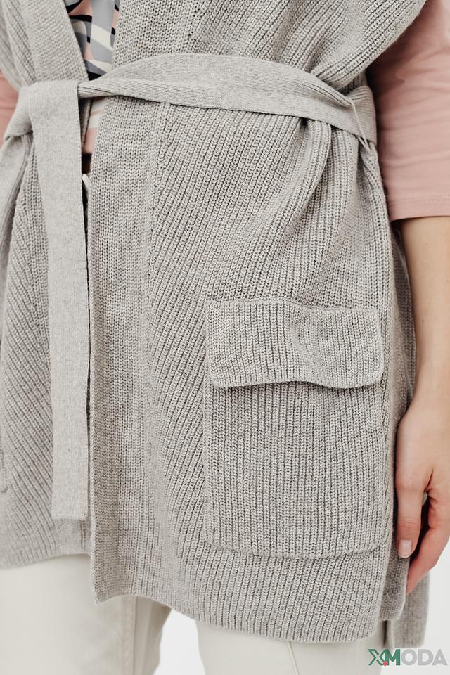 Модель имеет свободный крой, V-образный вырез и длинные рукава. Жилет застегивается на пояс, который позволяет регулировать посадку и подчеркнуть фигуру. На передней части расположены два удобных кармана.
