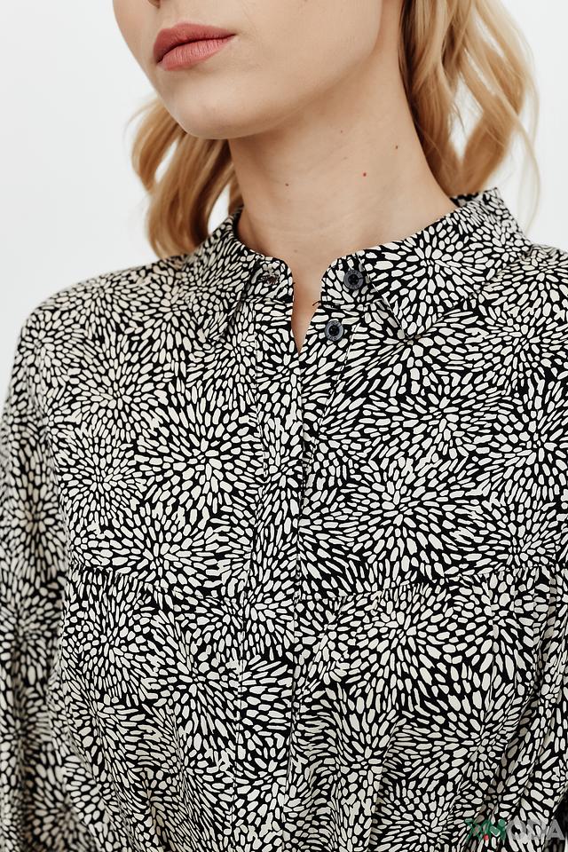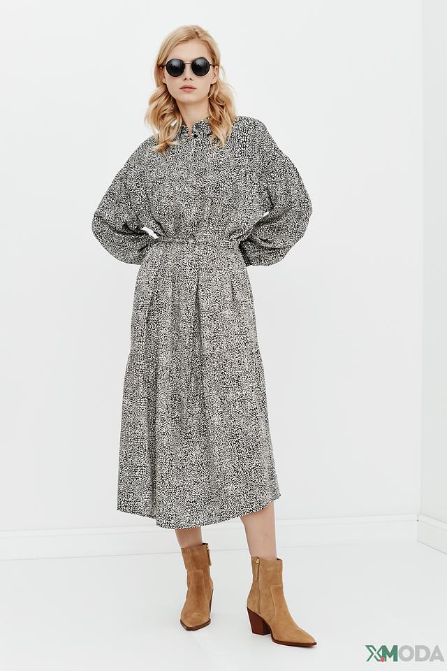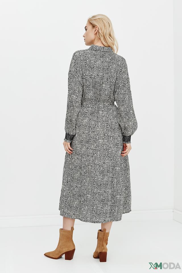 Основной цвет платья – чёрный, украшен мелким белым принтом в горошек, который придает образу игривость и свежесть. Платье имеет длинные рукава и воротник-стойку с V-образным вырезом, застегивающимся на пуговицы.