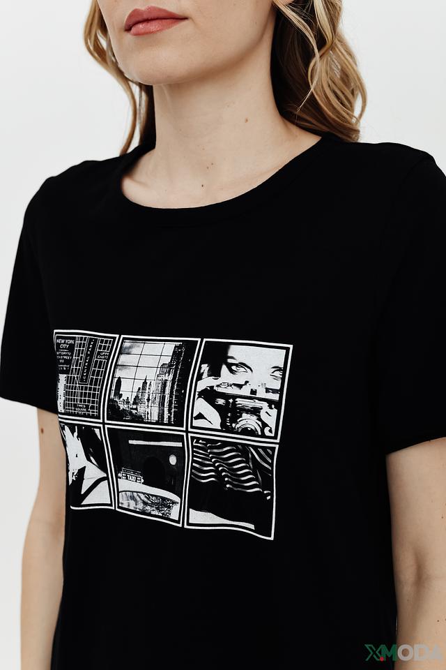 Основным акцентом является яркий принт на лицевой стороне, выполненный в стиле комикса. Принт состоит из нескольких графических элементов в бело-чёрной гамме, что придает футболке современный и динамичный вид.