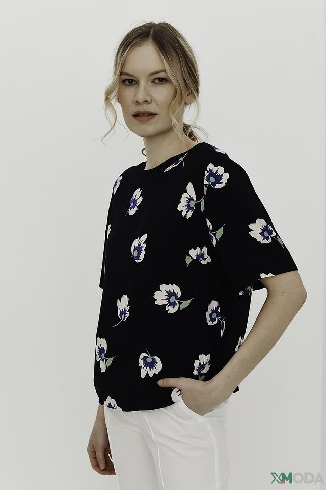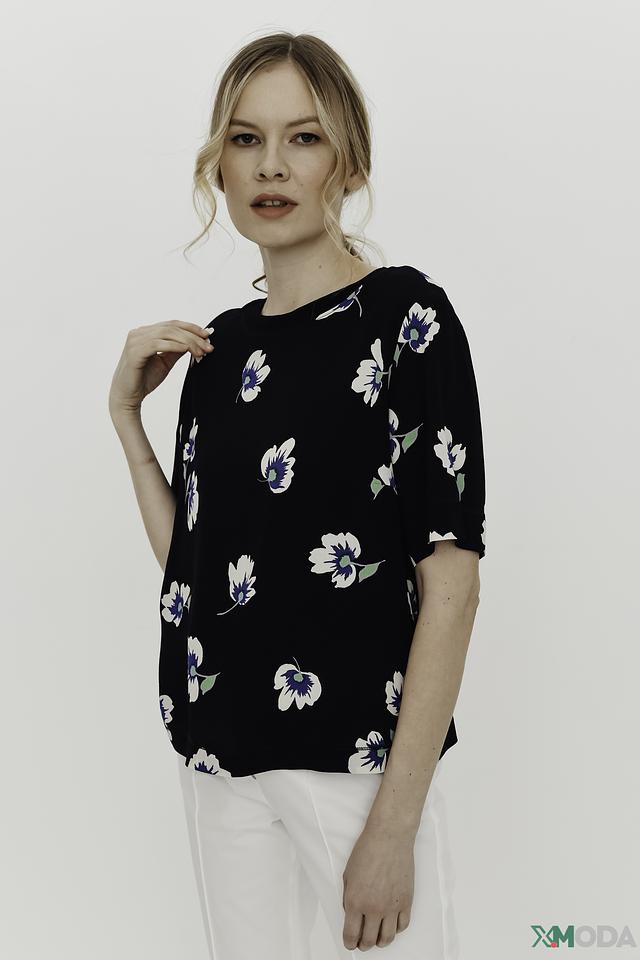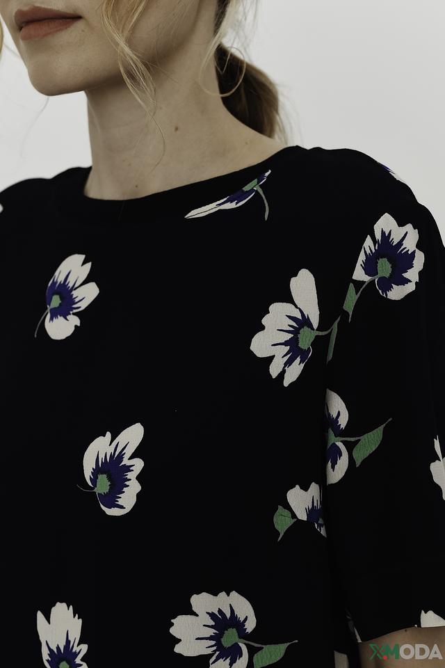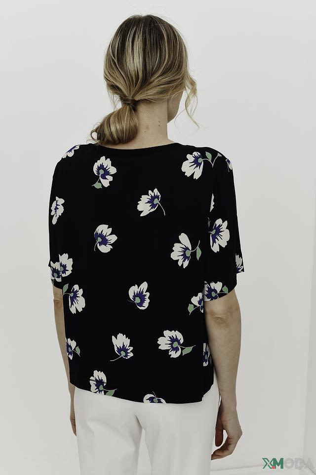 Основной цвет блузы – черный, который служит идеальным фоном для яркого цветочного принта. Принт состоит из белых и голубых цветов, что придает блузе свежий и романтичный вид.
