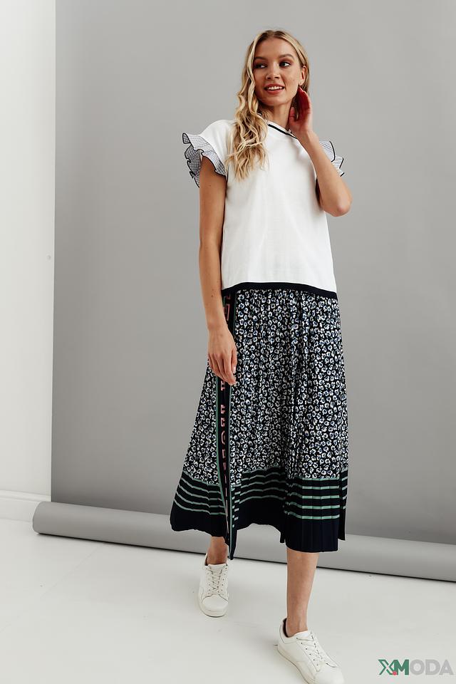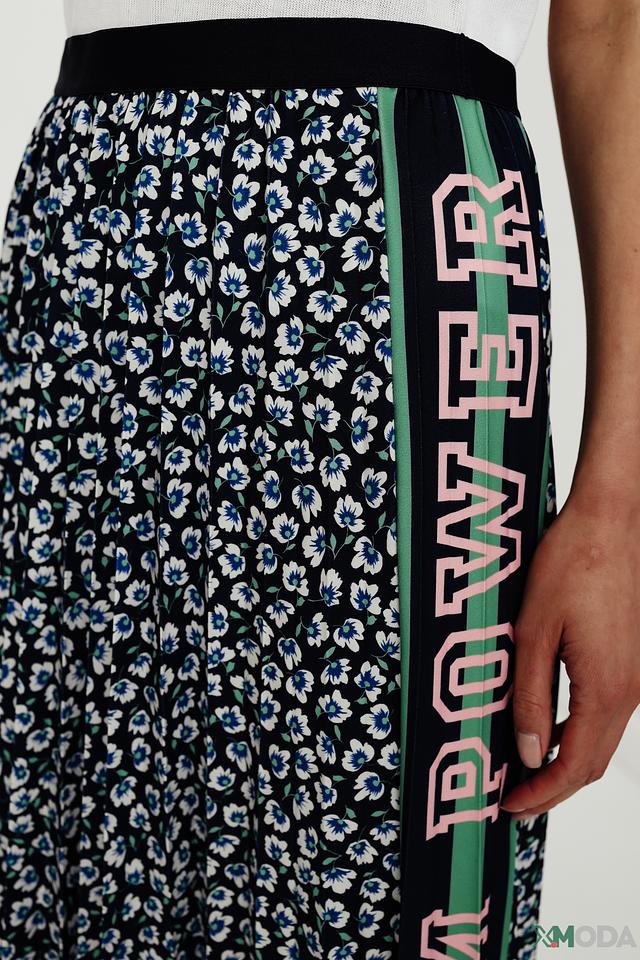 Юбка имеет плиссированную фактуру и украшена ярким цветочным принтом на темно-синем фоне. По бокам юбки расположены контрастные зеленые полосы и надпись "OPTIMISM POWER", добавляющие образу оригинальности.