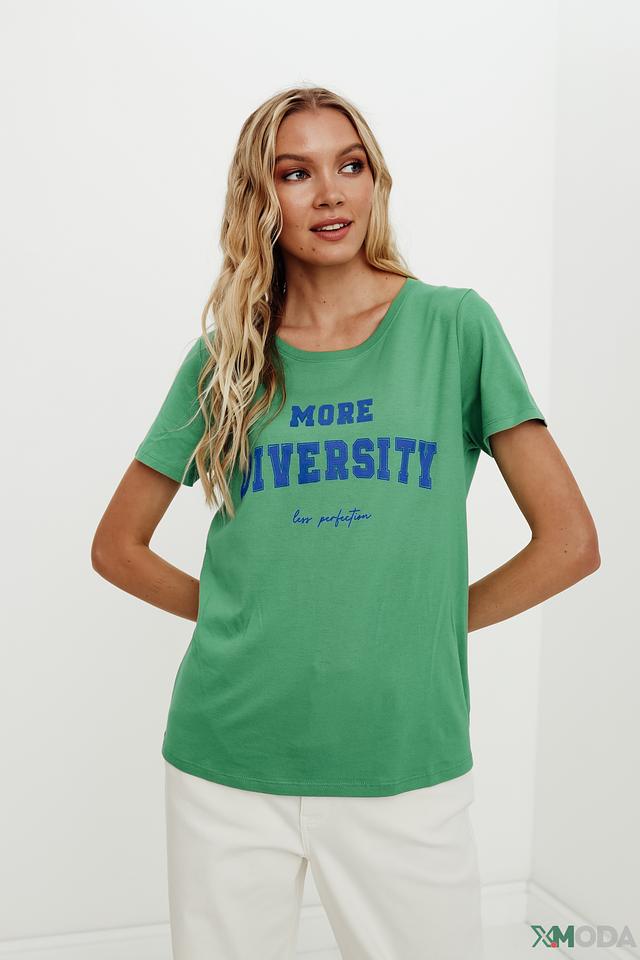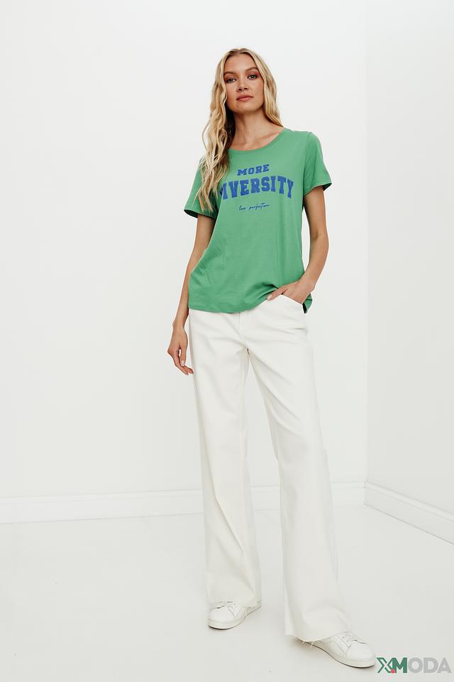 Зеленая футболка от Oui с ярким принтом "MORE UNIVERSITY". Изготовлена из мягкого хлопка с модалом, обеспечивающего комфорт и приятные ощущения при носке. Стильный и удобный вариант для повседневного образа. Состав: хлопок 50%, модал 50%
