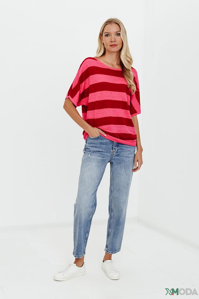 Женский пуловер Oui малинового цвета с ярким полосатым дизайном. Модель выполнена из 100% льна, что обеспечивает комфорт и воздухопроницаемость в жаркую погоду. Стильный и удобный выбор для создания повседневных образов. Состав: лен 100%
