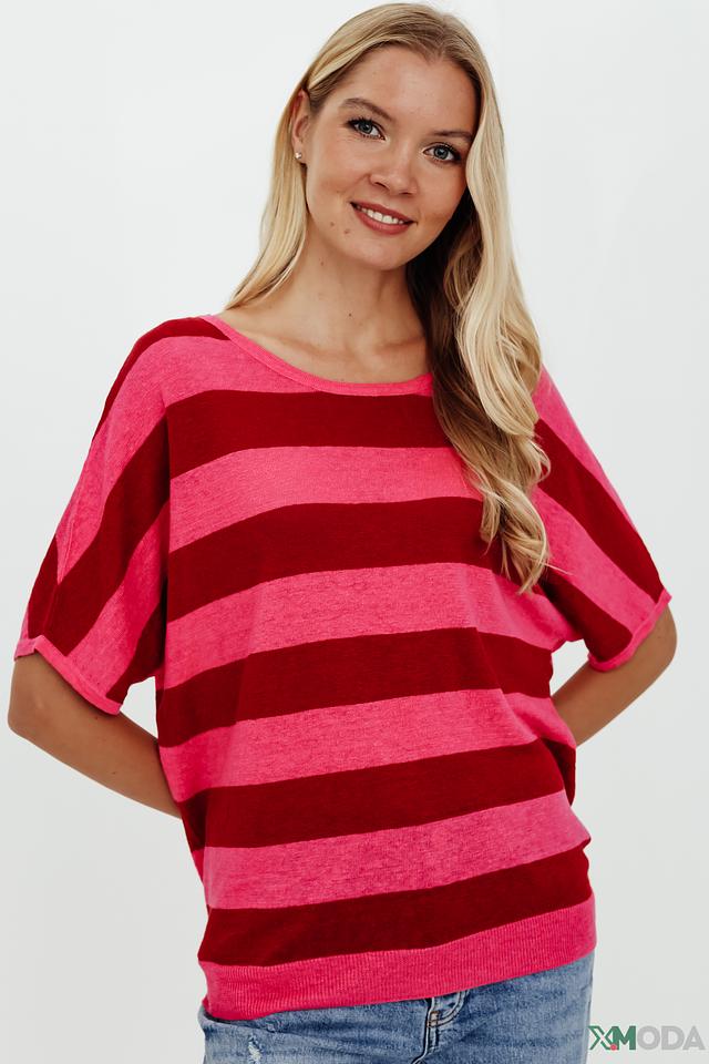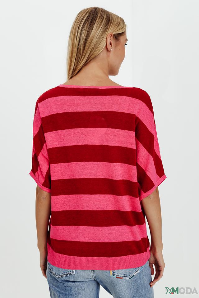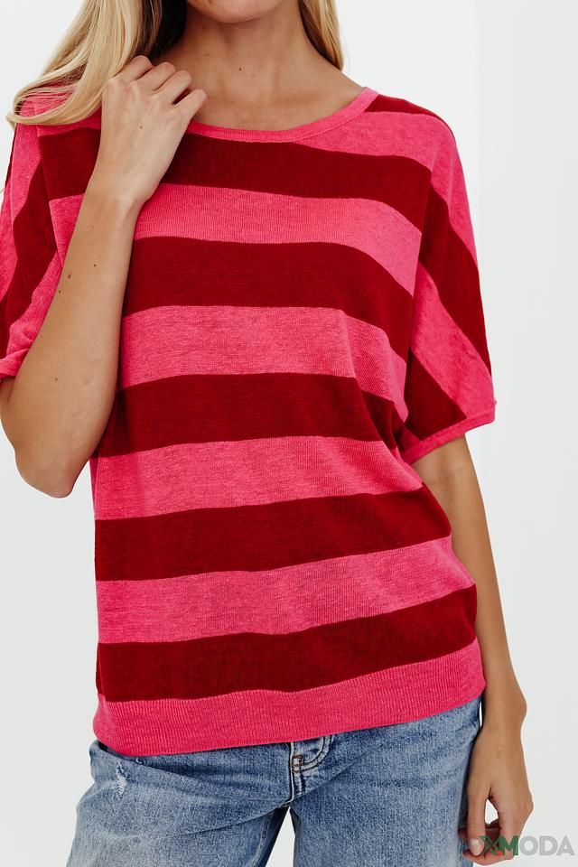 Пуловер имеет яркий полосатый дизайн, сочетающий в себе оттенки малинового и алого цветов. Свободный крой и короткие рукава делают его удобным и непринужденным в носке.