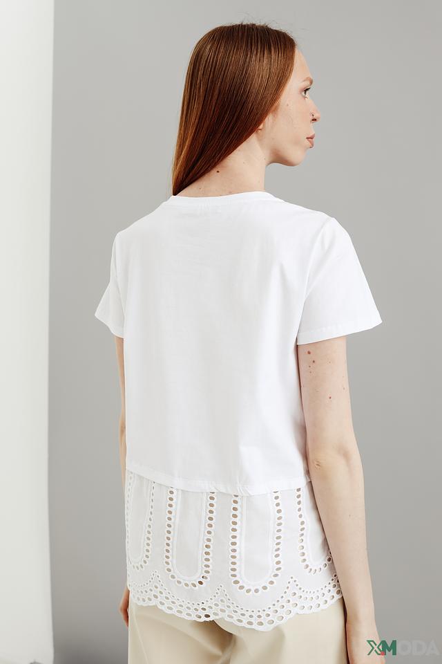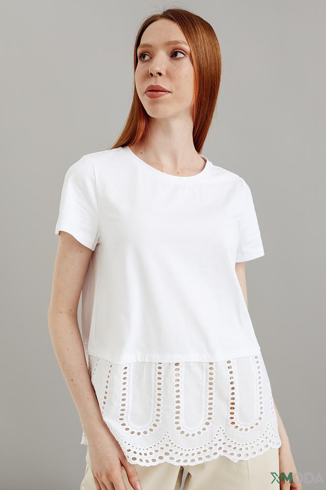 Особенностью модели является ажурное кружево, украшающее нижнюю часть блузы, что придает ей женственность и изысканность. Круглый вырез горловины и короткие рукава делают эту блузу идеальным выбором для теплой погоды.