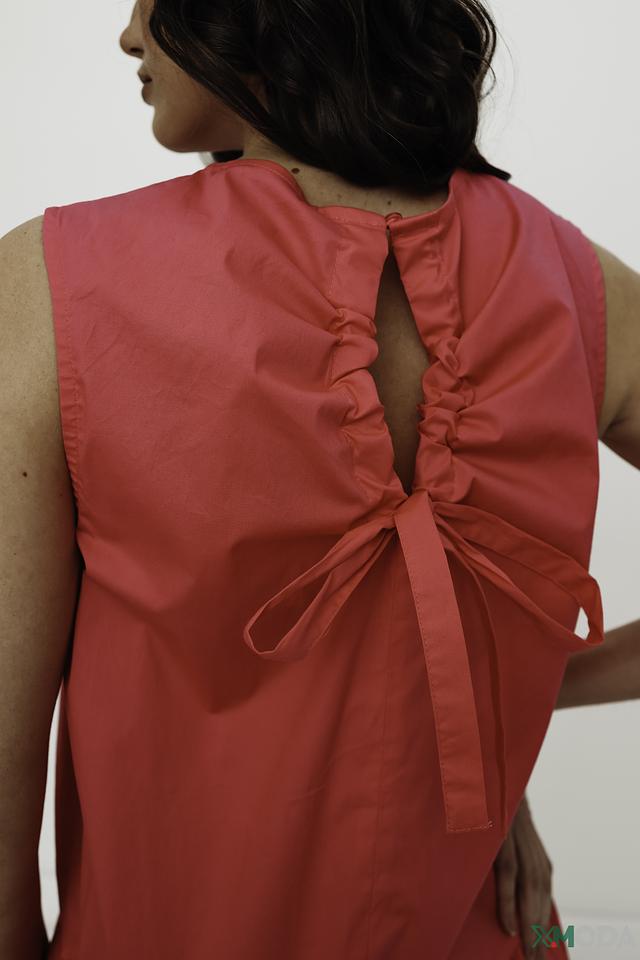 Состав ткани: 95% хлопок и 5% эластан. Хлопок обеспечивает мягкость и комфорт, а эластан – небольшую эластичность, что позволяет платью хорошо сидеть по фигуре. Платье имеет круглый вырез горловины и короткие рукава. Спинка платья дополнена небольшими завязками, которые добавляют изюминку в образ.