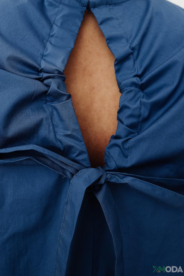 Платье имеет свободный крой, который не сковывает движений. Многослойная юбка с оборками придает образу воздушность и женственность. Вырез горловины округлый, а плечи открытые. На груди предусмотрена небольшая сборка, формирующая V-образный вырез с завязками.