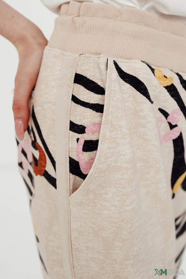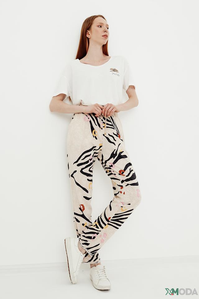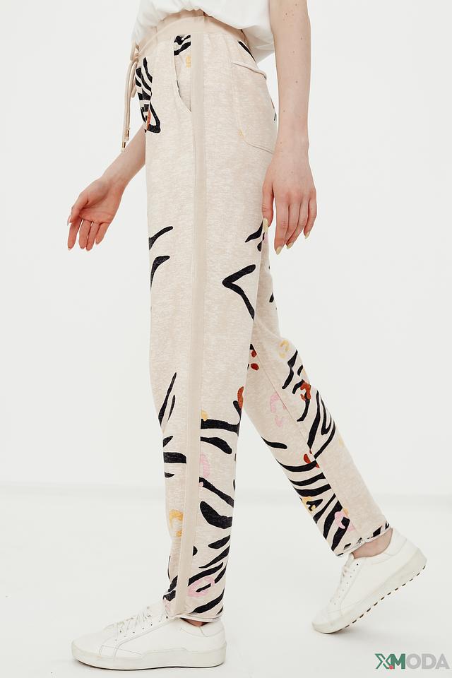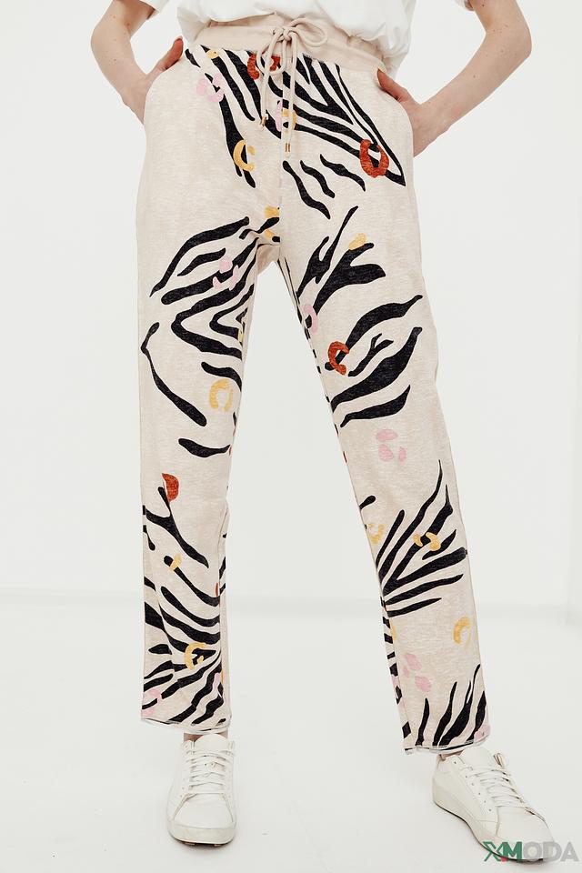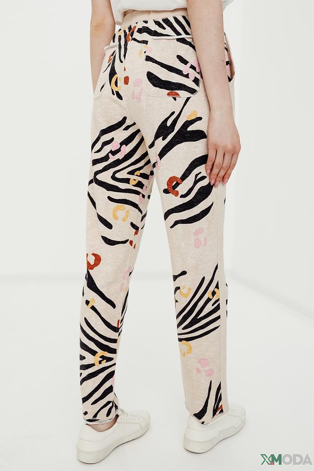Женские брюки Oui бежевого цвета с оригинальным принтом в виде зебры — стильное и комфортное решение для повседневного образа. Модель выполнена из мягкой ткани с добавлением хлопка, модала и эластана. Состав: хлопок 49%, модал 48%, эластан 3%