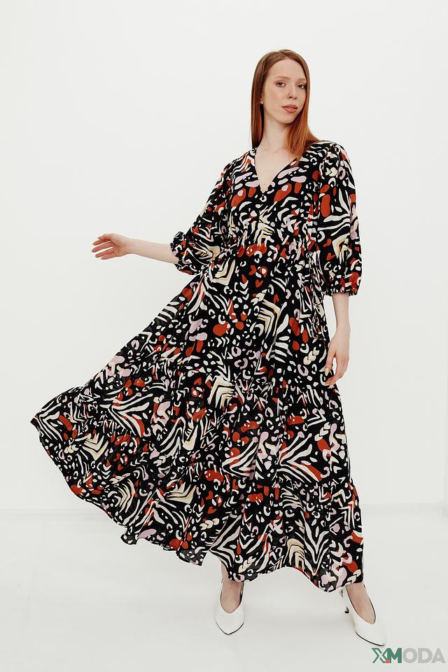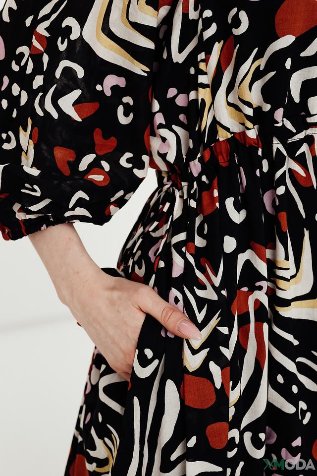 Модель имеет длину макси, V-образный вырез и рукава 3/4 с манжетами. Платье украшено ярким абстрактным принтом в ретро-стиле, сочетающим в себе оттенки черного, оранжевого, розового и бежевого.