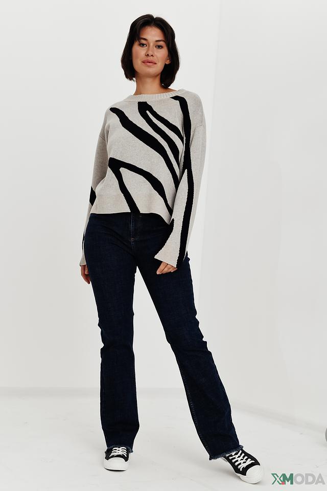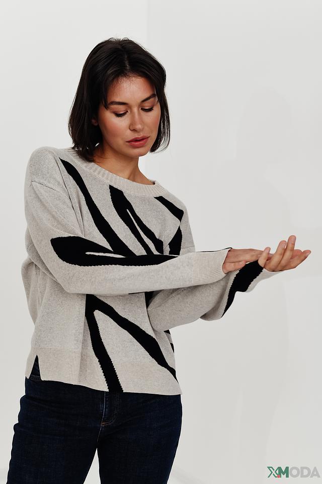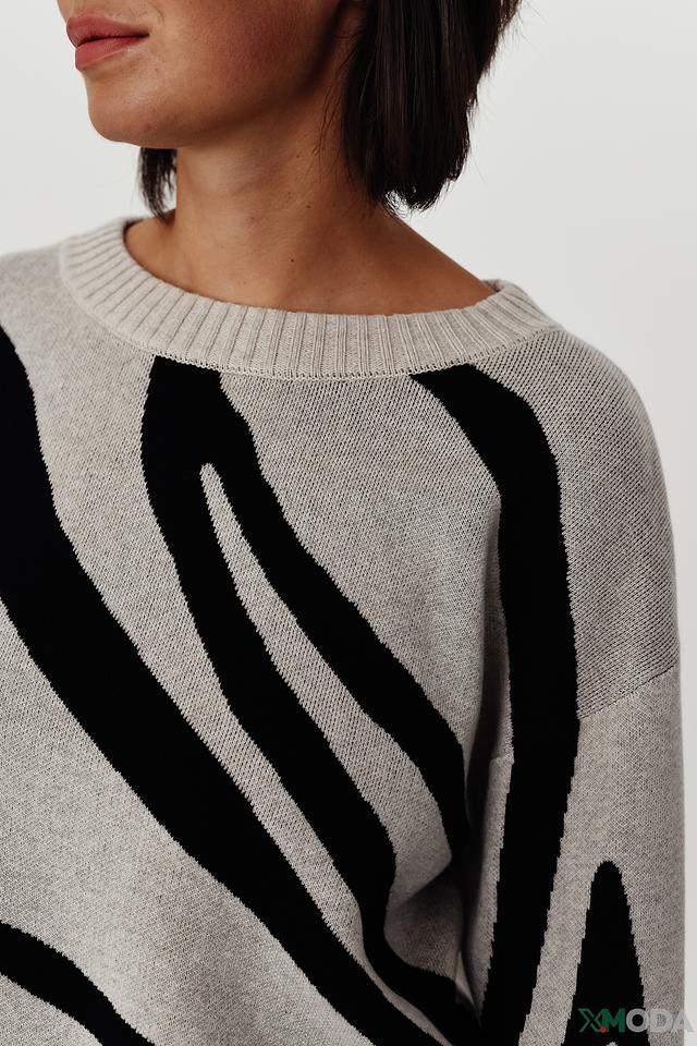 Пуловер имеет свободный крой и круглый вырез горловины. Его отличает оригинальный узор в виде абстрактных полос, напоминающих окрас зебры, выполненный в контрастных чёрных и белых тонах на сером фоне.