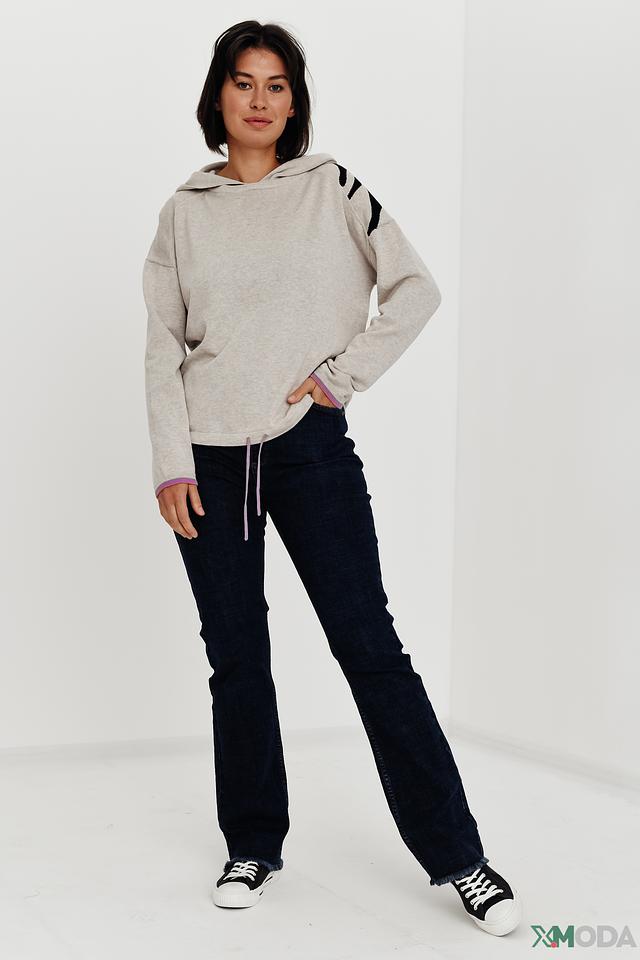 Отделка манжет и низа изделия выполнена из эластичной ткани лилового цвета, что придает толстовке особый шарм. Удобная и практичная модель, идеально подходящая для создания повседневных образов. Состав: 100% хлопок.