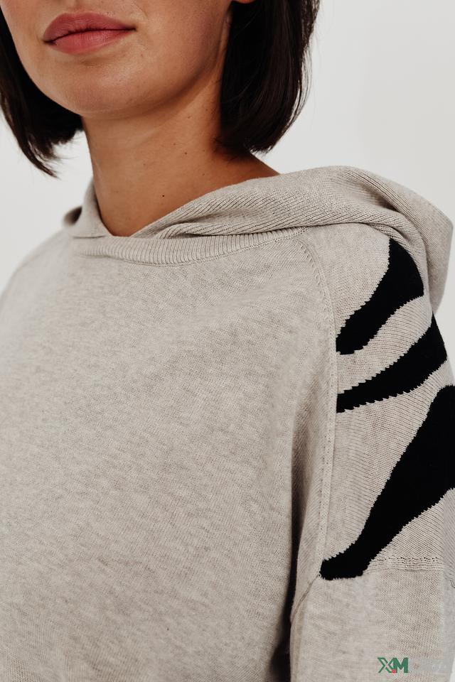 Толстовка имеет свободный крой, капюшон и длинные рукава. Основной цвет – светло-серый меланж. На спине расположен эффектный чёрно-белый принт, добавляющий образу динамичности.