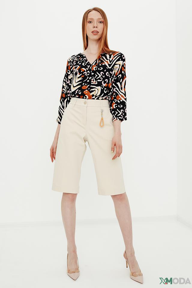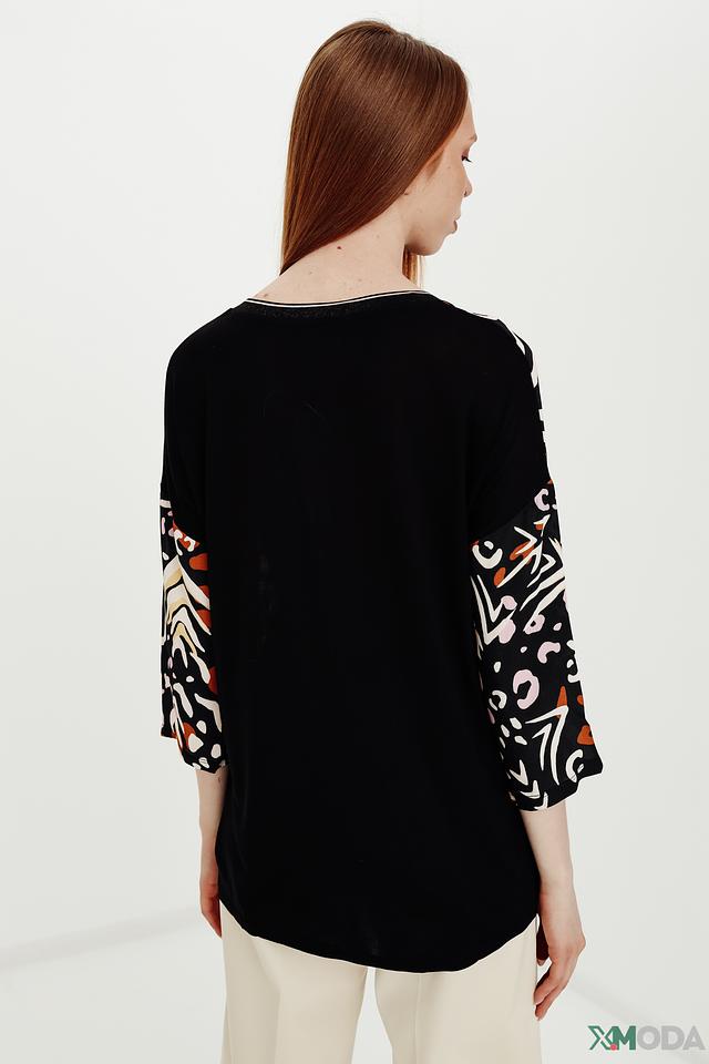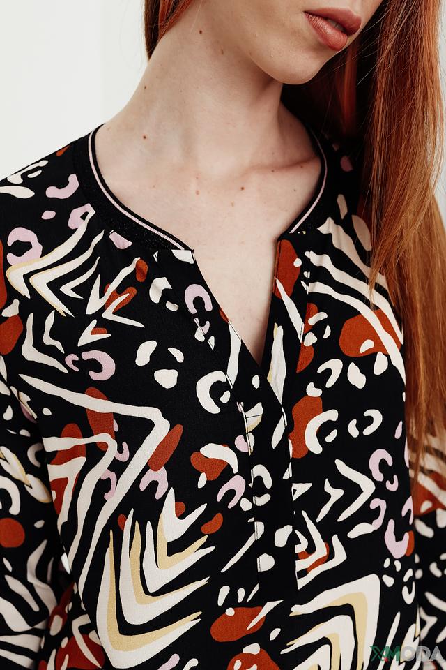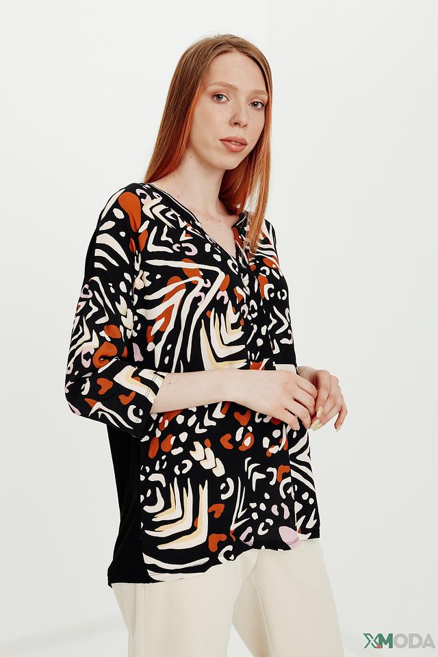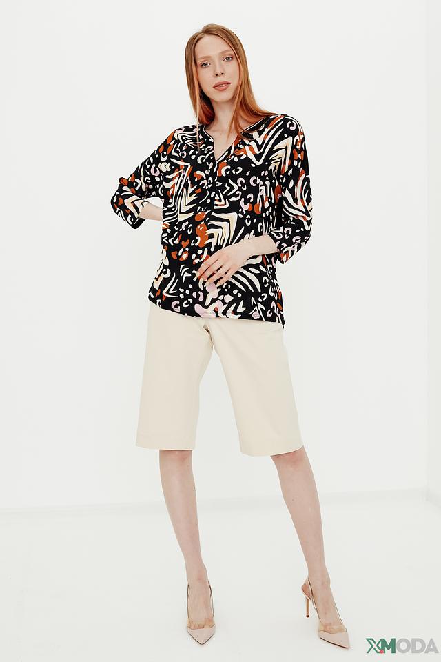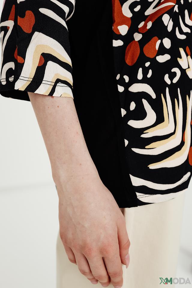 Основной цвет блузы – черный, но ее украшает оригинальный принт, выполненный в оранжевых, белых и коричневых тонах. Принт представляет собой абстрактные формы, напоминающие животные узоры.