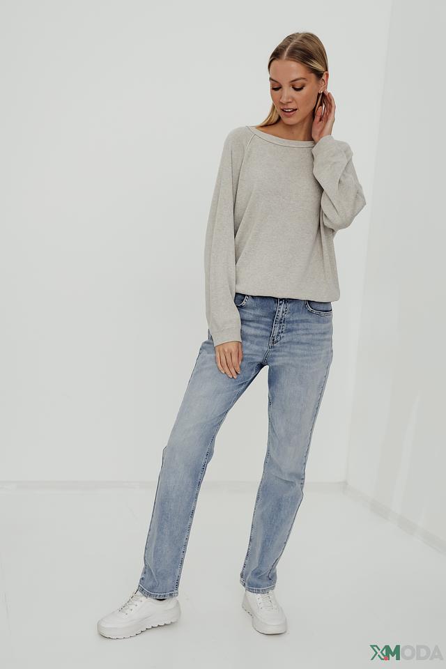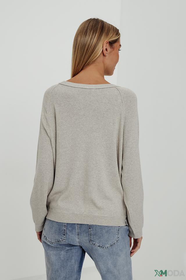 Пуловер имеет свободный крой и округлый вырез горловины. Рукава – фонарики, что придает образу романтичность и лёгкость. Текстура ткани слегка меланжевая, что добавляет изделию визуальный интерес.