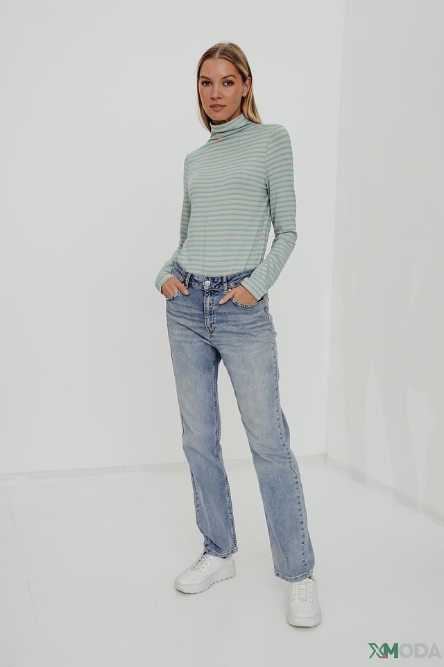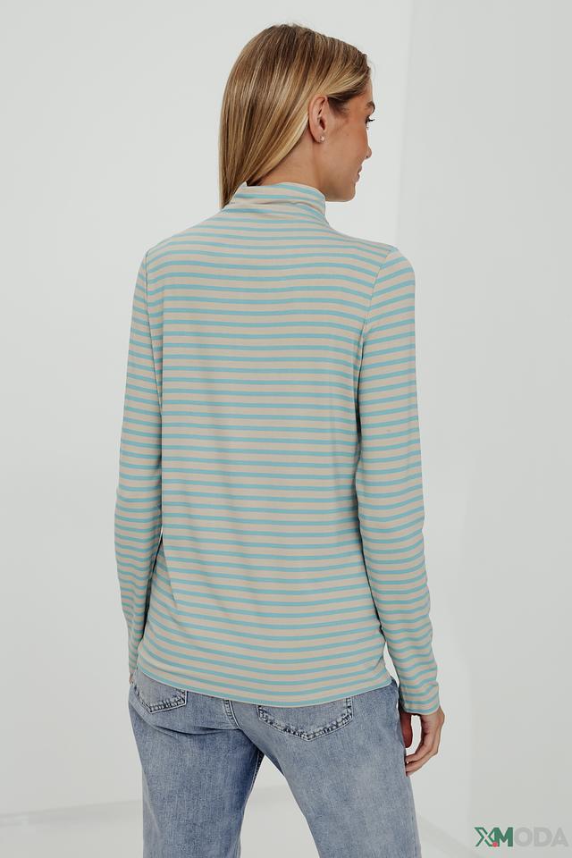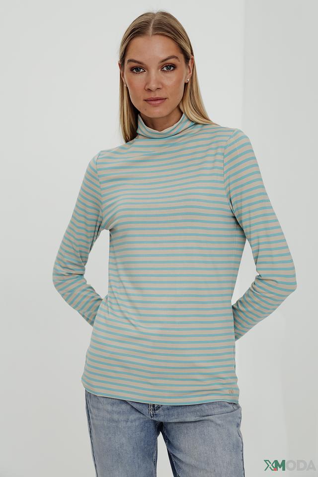 Водолазка имеет классический крой с длинными рукавами и высоким воротом, который подчеркивает элегантность образа. Бежево-голубая полоска придает модели свежий и стильный вид.