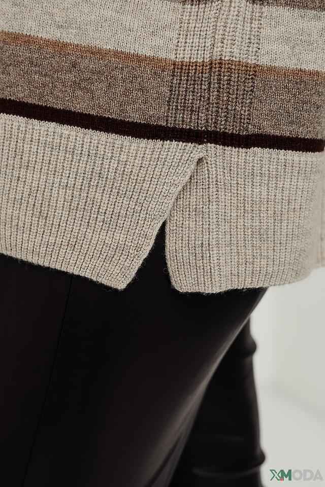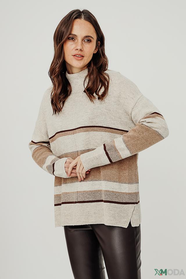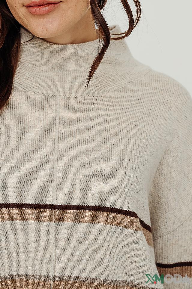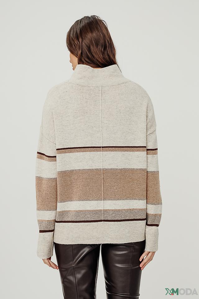 Пуловер имеет свободный крой, который обеспечивает комфорт в носке и позволяет создавать различные образы. Горизонтальные полосы в бежевых и коричневых тонах придают изделию стильный и современный вид. Высокий воротник-стойка добавляет элегантности и защищает от холода.