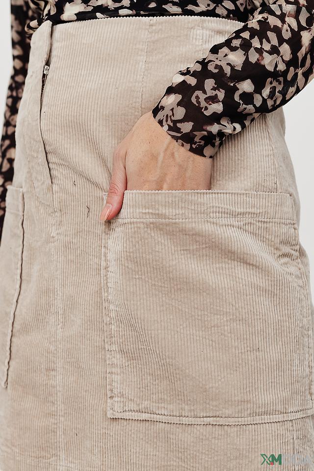 Юбка имеет классический крой и длину мини, подчеркивающую фигуру. Наличие накладных карманов добавляет практичности и оригинальности дизайну. Бежевый цвет делает юбку универсальной и легко сочетаемой с различными элементами гардероба.