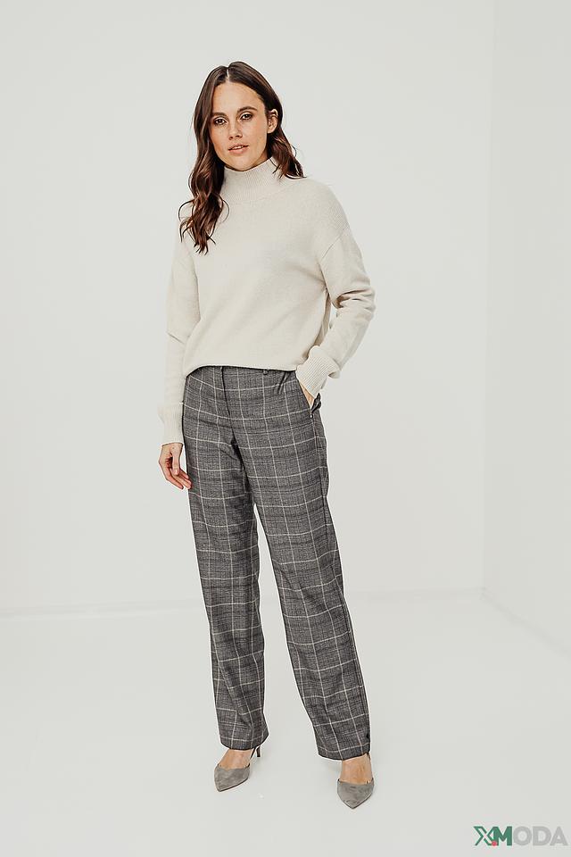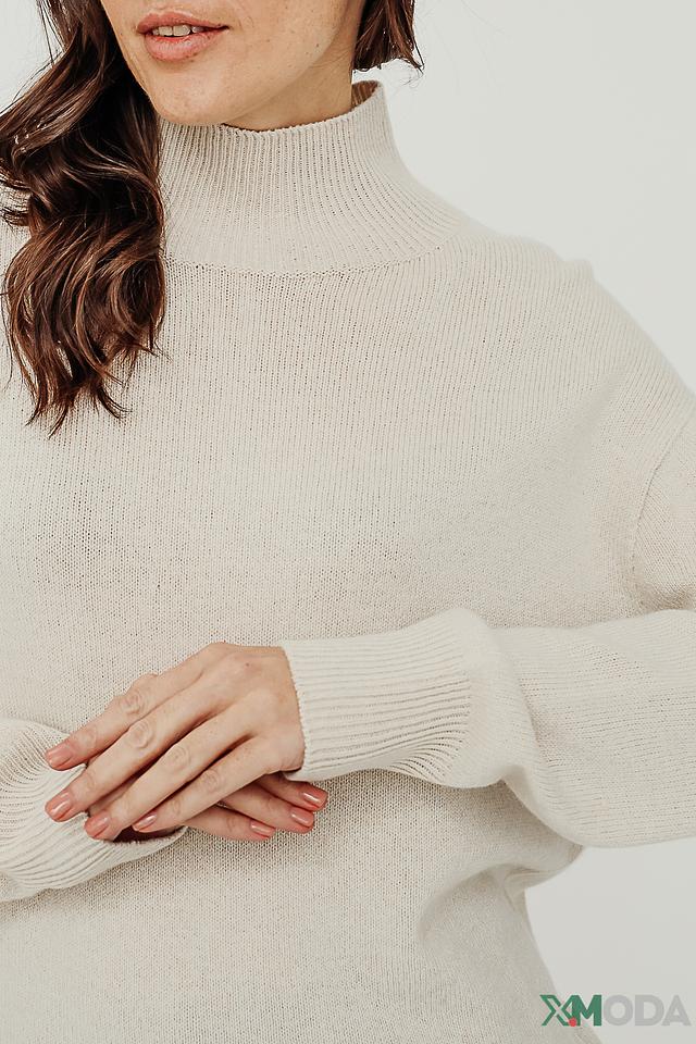 Пуловер имеет классический крой с высоким горлом, который подчеркивает элегантность образа. Длинные рукава и слегка свободный силуэт обеспечивают комфорт при носке. Текстура вязки придает изделию объем и визуальный интерес.