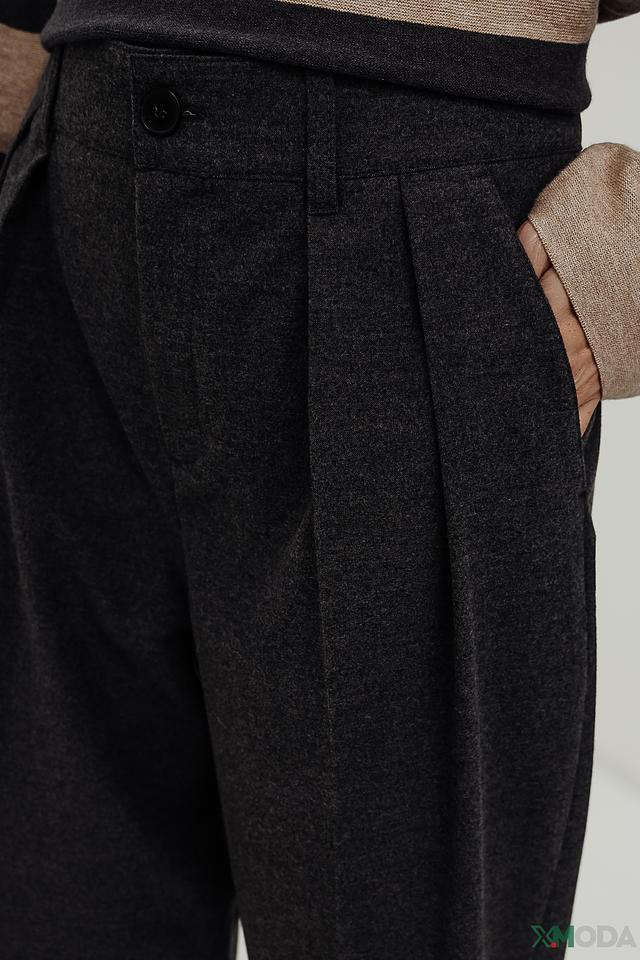 Брюки имеют высокую посадку, которая визуально удлиняет ноги и подчеркивает талию. Широкие защипы на талии придают брюкам объем и создают свободный, расслабленный силуэт. Застежка на молнию и пуговицу обеспечивает надежную фиксацию.