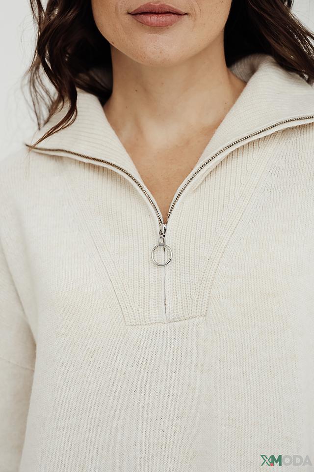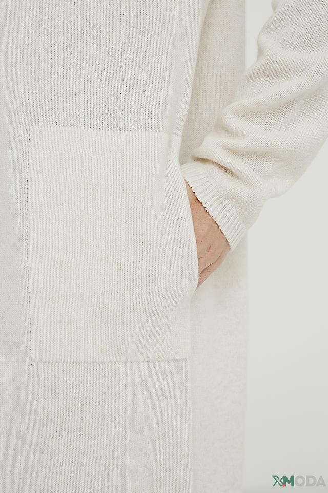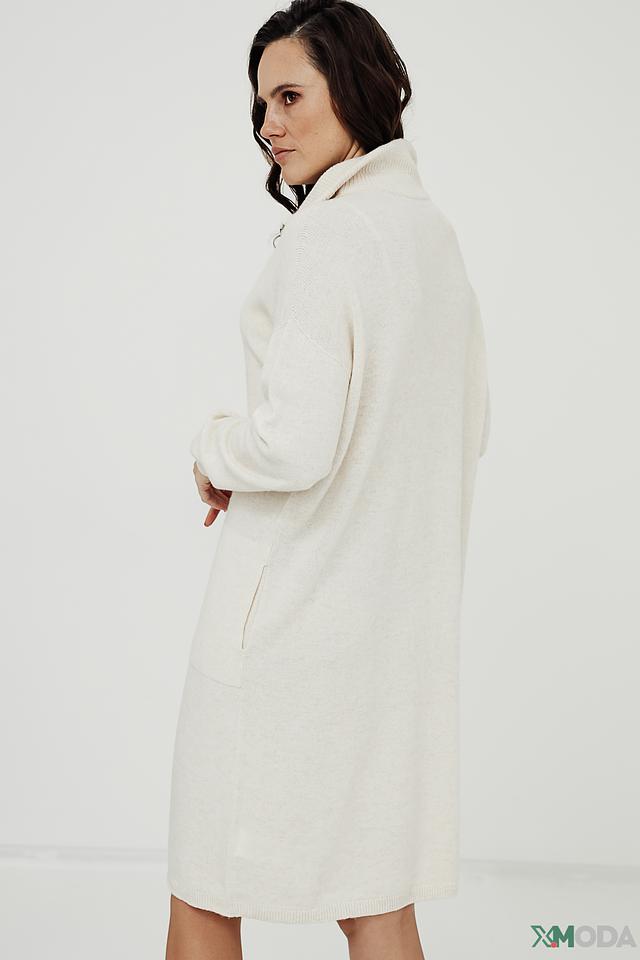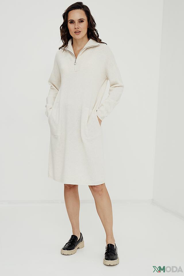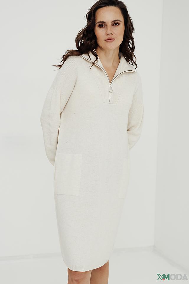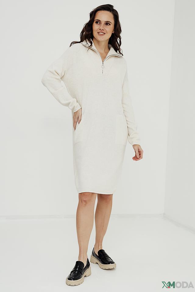 Платье имеет прямой силуэт, длину миди и воротник-стойку с короткой молнией. Боковые карманы добавляют практичности и удобства. Текстура вязаного полотна придает изделию уютный и непринужденный вид.