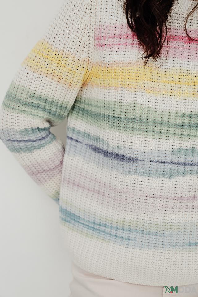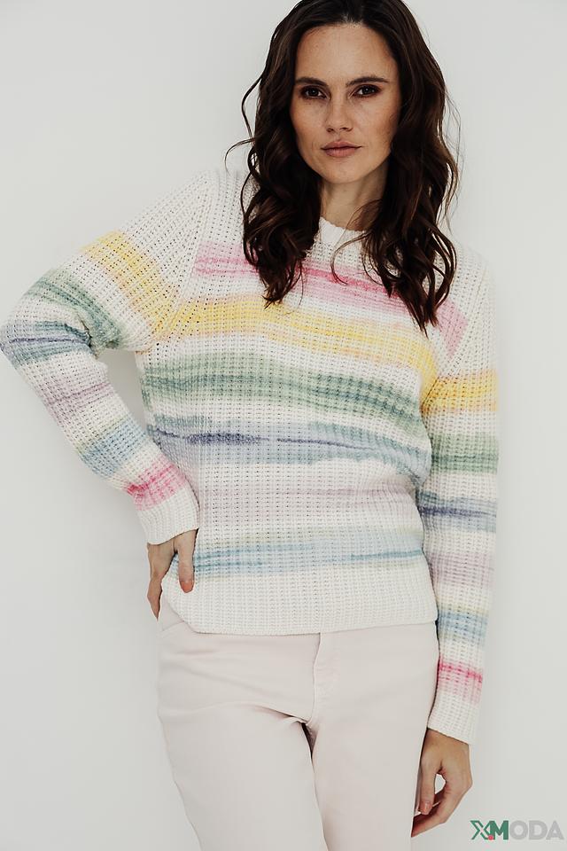Этот пуловер от Oui – идеальный выбор для тех, кто ценит комфорт и стиль. Пуловер выполнен в яркой полосатой расцветке, сочетающей в себе нежно-розовый, жёлтый, голубой и зелёный цвета.