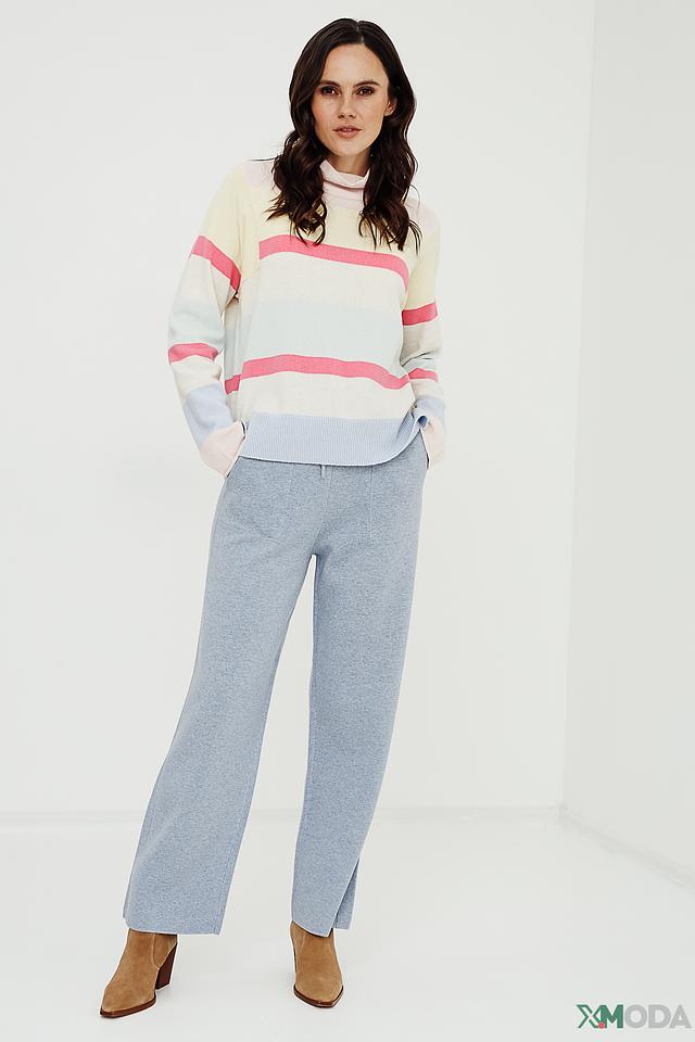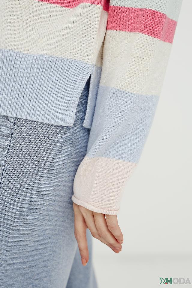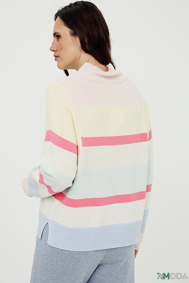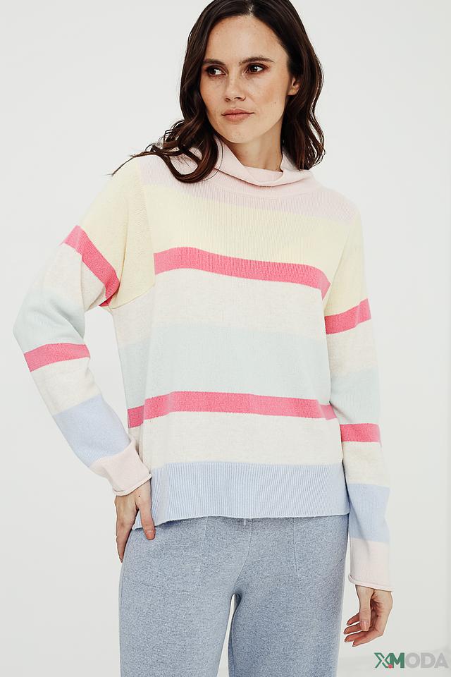Этот стильный пуловер от бренда Oui выполнен в приятной цветовой гамме с горизонтальными полосами. Основной цвет – нежно-розовый, дополненный оттенками голубого, бледно-жёлтого и белого.