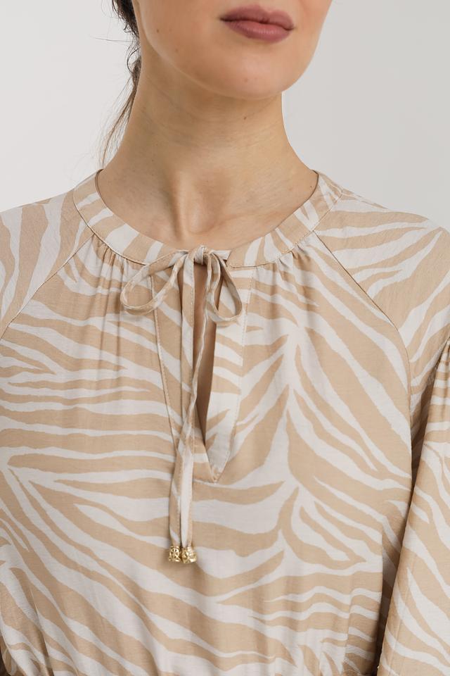 Платье от Oui бежевого цвета с оригинальным принтом "зебра" станет отличным дополнением к вашему гардеробу. Модель с длинными рукавами и завязками на горловине подчеркнет вашу женственность и индивидуальность. Состав: вискоза 84%, полиамид 16%
