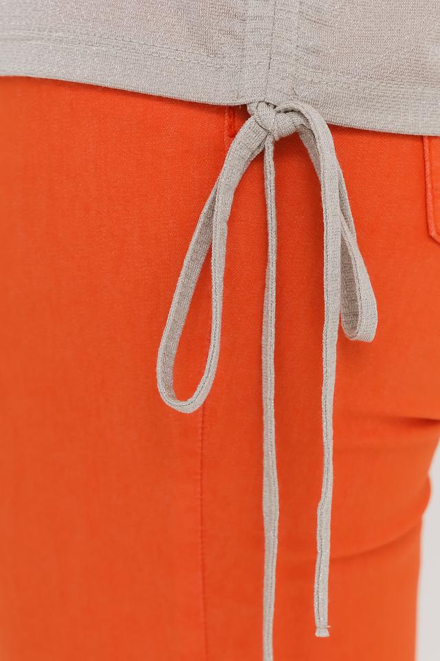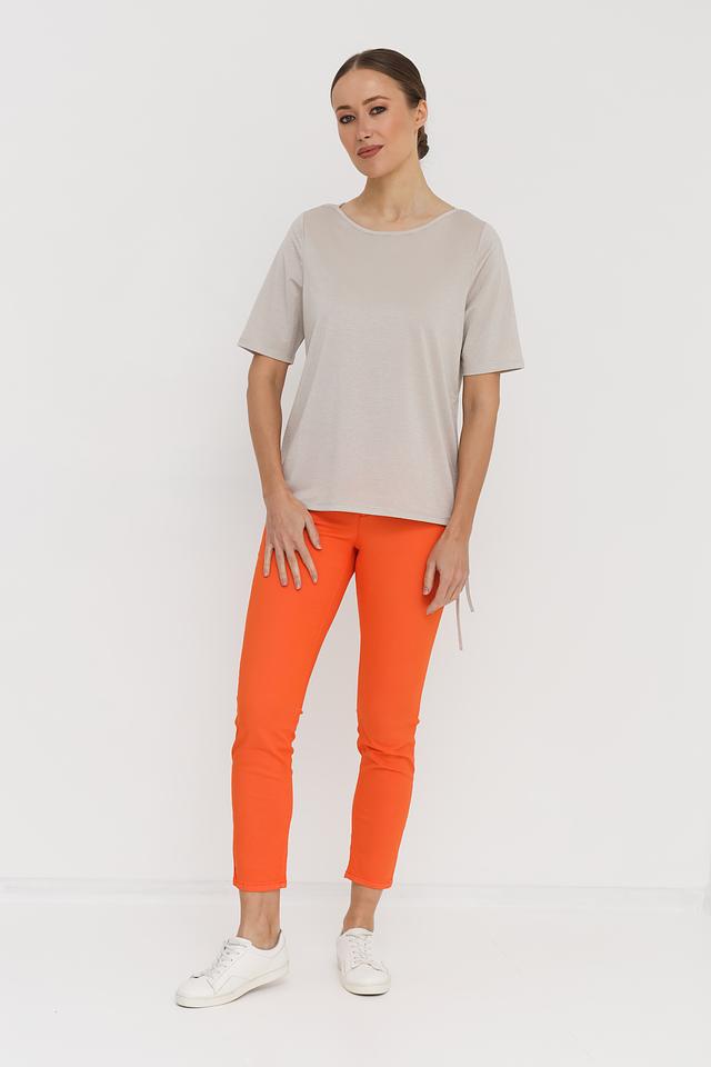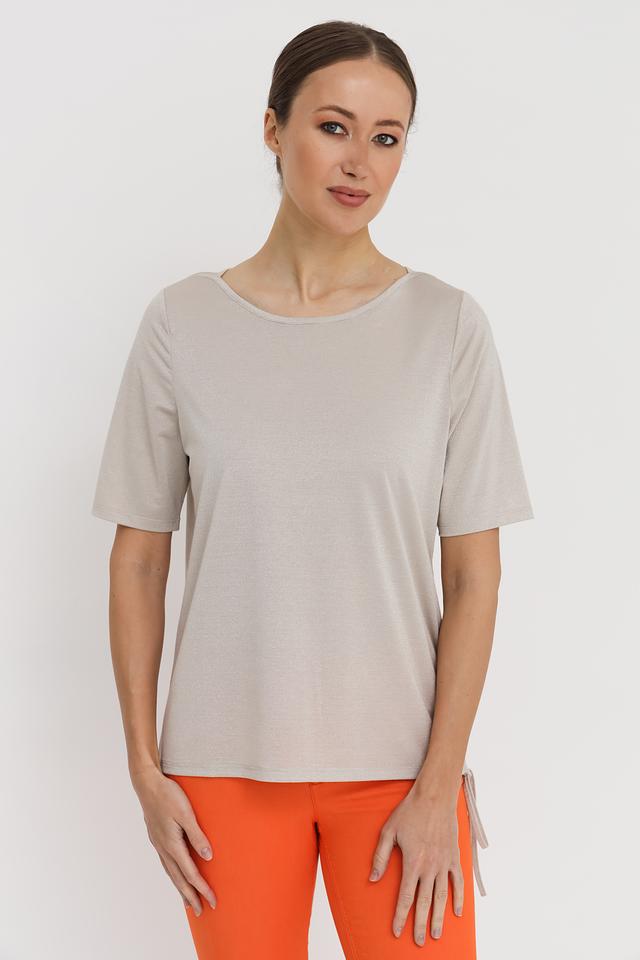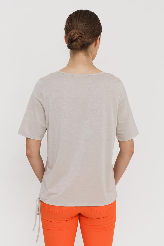 Особенностью данной модели являются декоративные завязки по бокам, которые позволяют регулировать силуэт и добавляют изюминку в дизайн. Футболка представлена в сером цвете, который легко сочетается с другими элементами одежды.