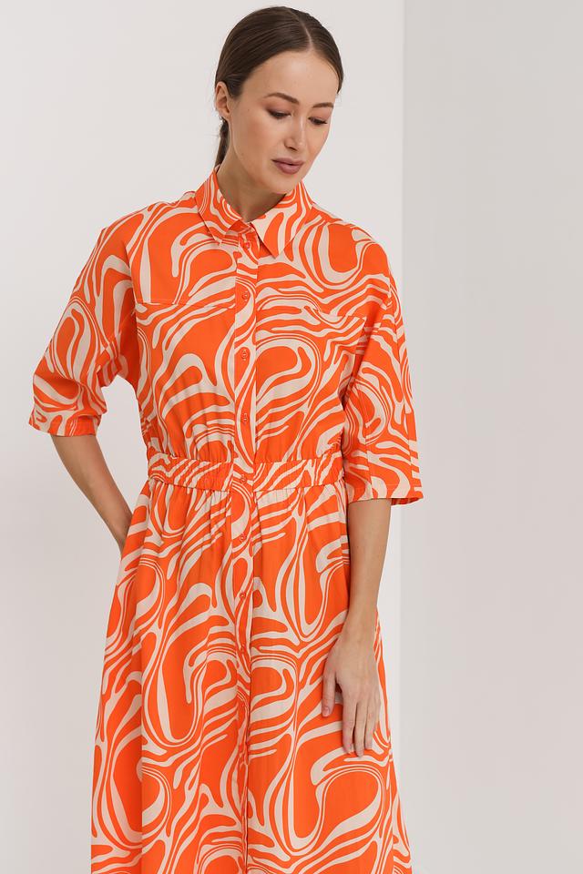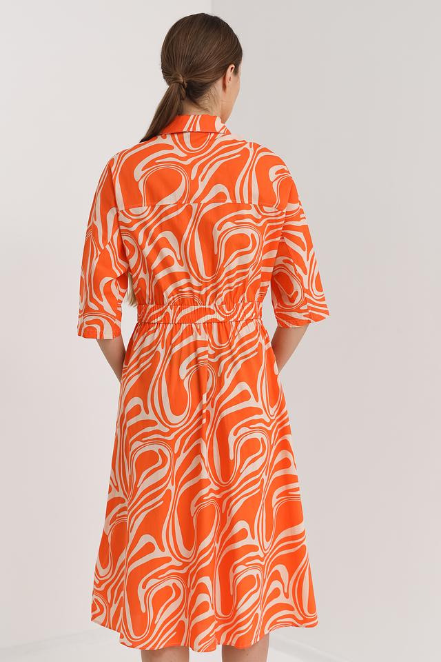 Платье имеет яркий оранжевый цвет и эффектный волнистый принт, который делает его уникальным и привлекательным. Силуэт платья приталенный, с завышенной талией и юбкой клеш, что подчеркивает женственность и создает элегантный образ.