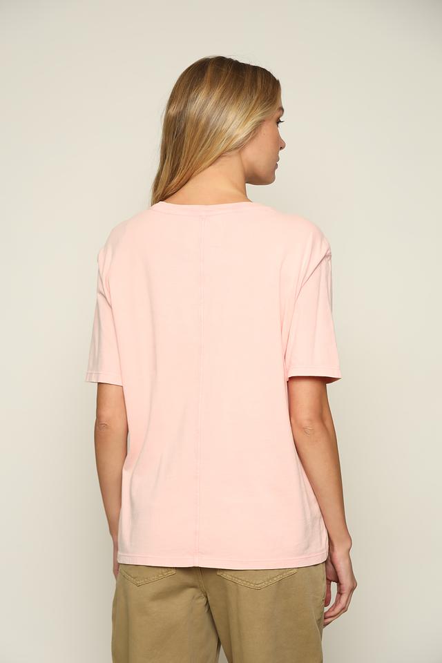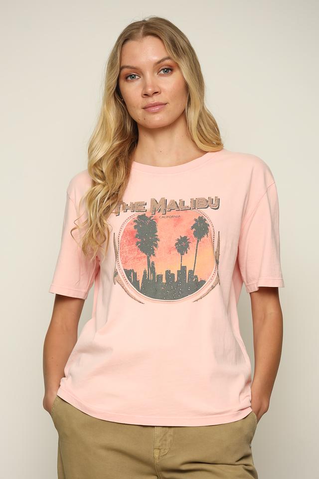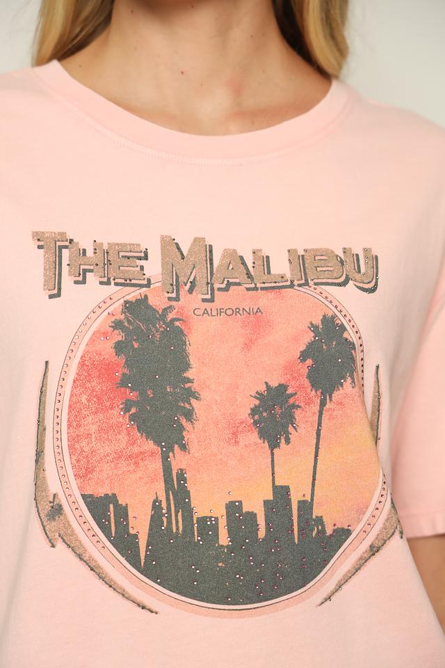 Футболка имеет нежно-розовый цвет и украшена ярким принтом "The Malibu California", изображающим пальмы и закат. Принт выполнен в винтажном стиле, что придает футболке особый шарм.