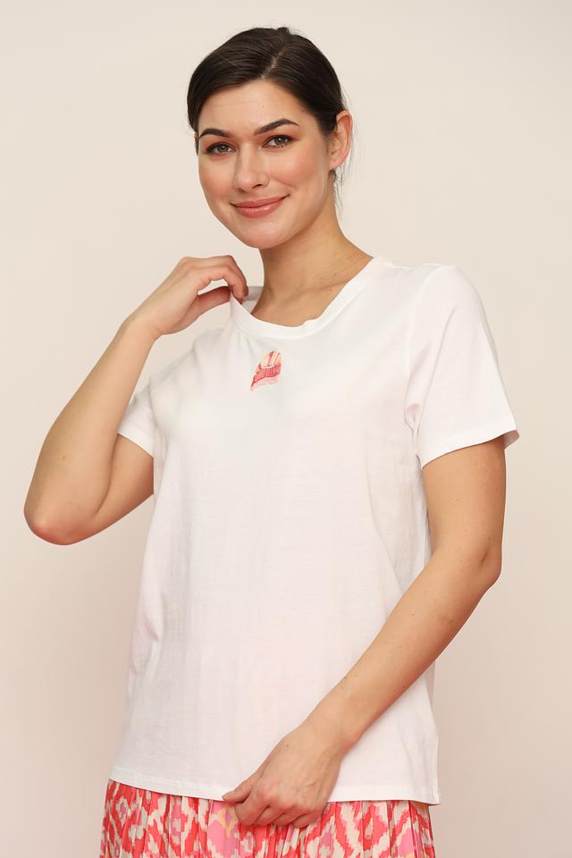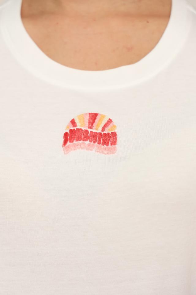 Женская футболка Oui белого цвета с нежной вышивкой в виде восходящего солнца. Изготовлена из 100% хлопка, обеспечивающего комфорт и воздухопроницаемость. Стильный и лаконичный дизайн. Состав: хлопок 100%