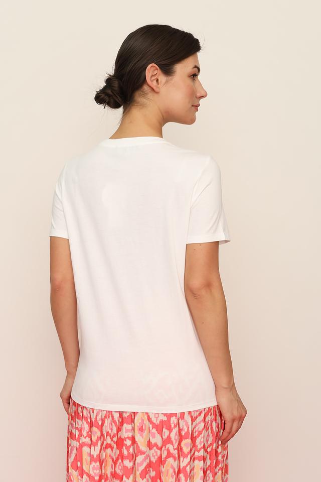 Футболка имеет классический прямой крой, короткие рукава и круглый вырез горловины. Она идеально подходит для создания повседневных образов, легко сочетается с джинсами, юбками и шортами. Универсальный белый цвет позволяет комбинировать футболку с различными элементами одежды и аксессуарами.