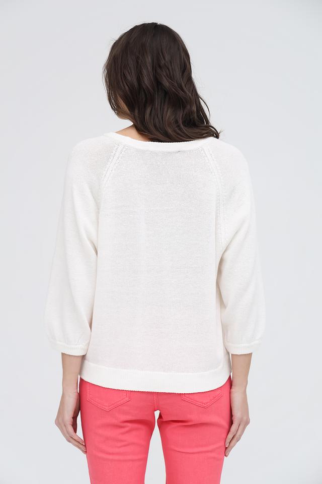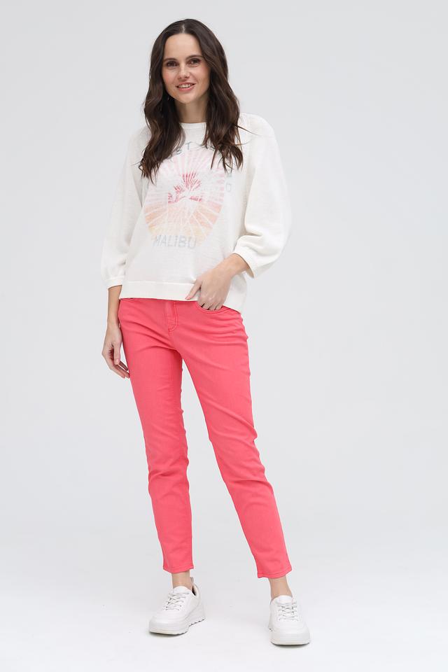 Белый пуловер от Oui с ярким принтом "Malibu" станет стильным дополнением к вашему гардеробу. Модель выполнена из мягкого сочетания льна и хлопка, обеспечивая комфорт и воздухопроницаемость. Состав: лен 58%, хлопок 42%
