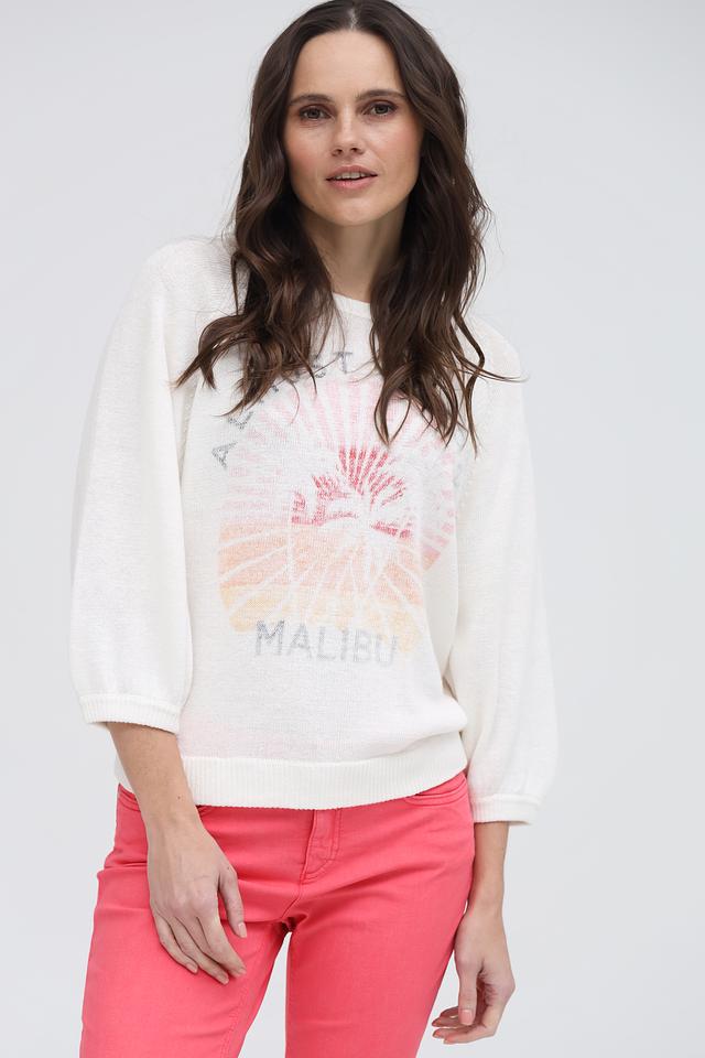 Этот стильный пуловер от бренда Oui выполнен в белом цвете и украшен ярким принтом с изображением солнца и надписью "Malibu". Модель имеет свободный крой и рукава 3/4, что делает ее универсальной для различных образов.