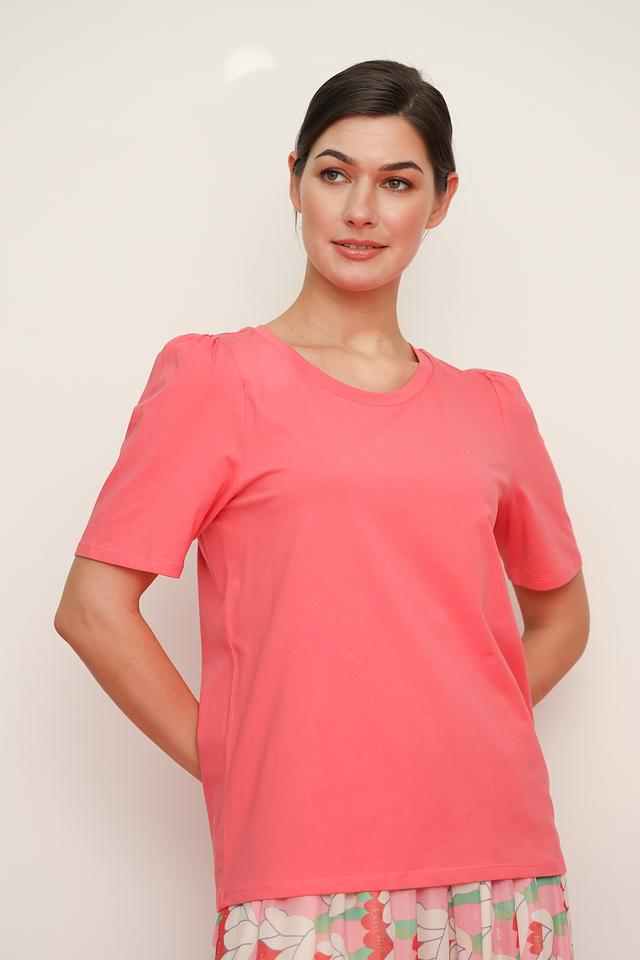 Коралловая футболка от Oui с короткими рукавами-фонариками. Эта модель имеет свободный крой и круглый вырез горловины. Изготовлена из мягкого хлопка с добавлением эластана для комфорта и лучшей посадки. Состав: хлопок 95%, эластан 5%