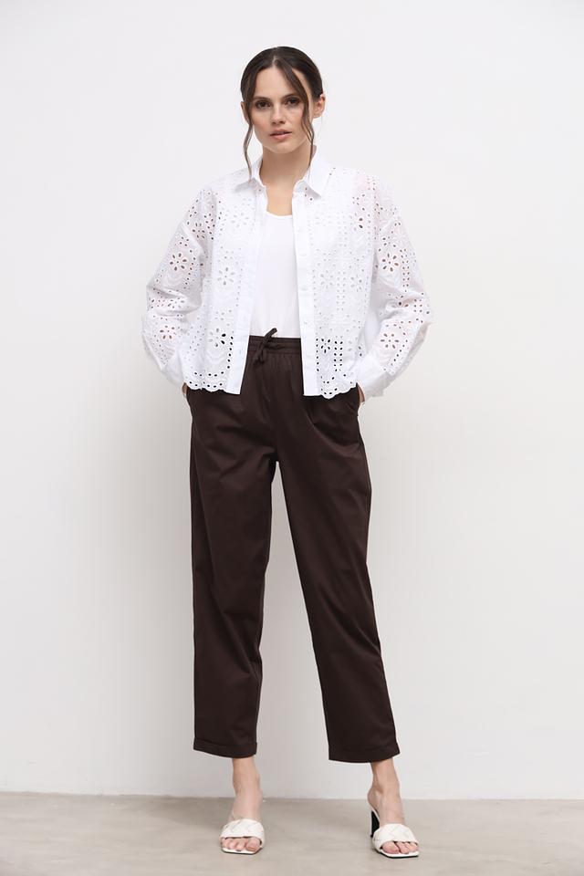 Брюки имеют прямой крой и завышенную талию, что визуально удлиняет ноги и подчеркивает фигуру. Пояс на кулиске позволяет регулировать посадку по фигуре. Удобная длина 7/8 делает их идеальными для любого времени года.