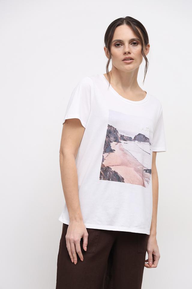 Особенностью данной модели является яркий принт с изображением пейзажа, который добавляет ей индивидуальности и стиля. Футболка имеет прямой крой, короткие рукава и классический круглый вырез горловины.