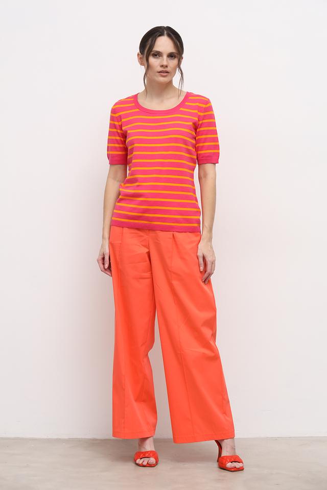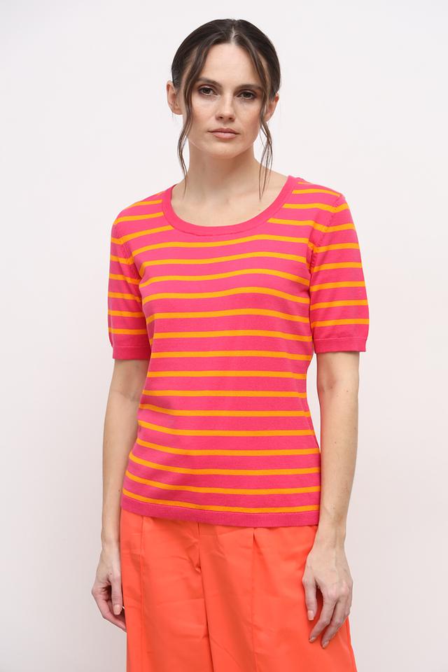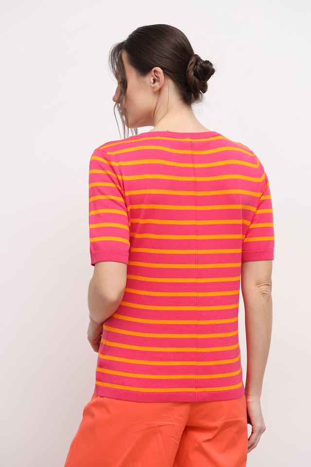 Розовый пуловер от Oui с короткими рукавами и ярким полосатым дизайном. Изготовлен из мягкого хлопка с добавлением полиамида для комфорта и долговечности. Идеальный выбор для создания стильного и непринужденного образа. Состав: хлопок 80%, полиамид 20%