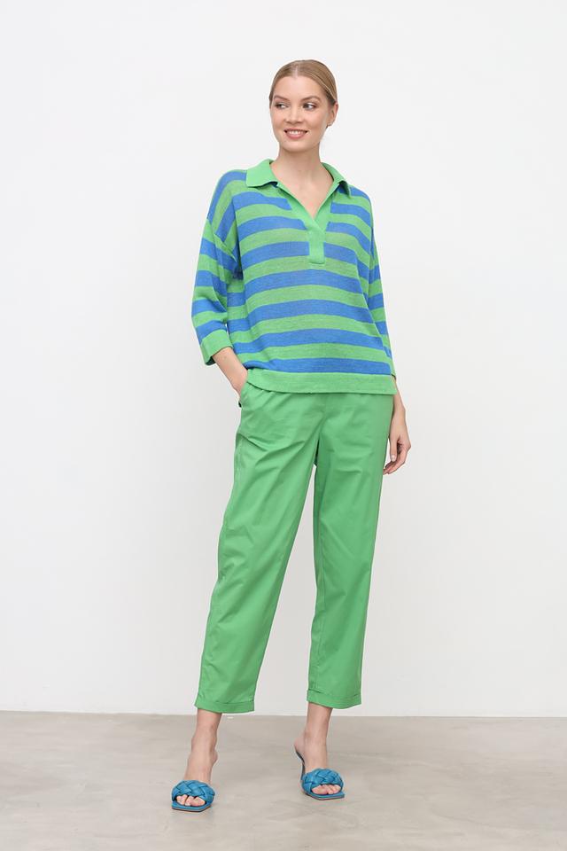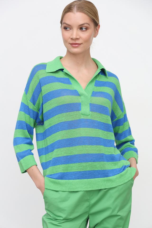 Женский пуловер Oui зелёного цвета с ярким полосатым узором и воротником-поло. Модель выполнена из натурального льна, что обеспечивает комфорт и воздухопроницаемость в тёплую погоду. Состав: лен 100%