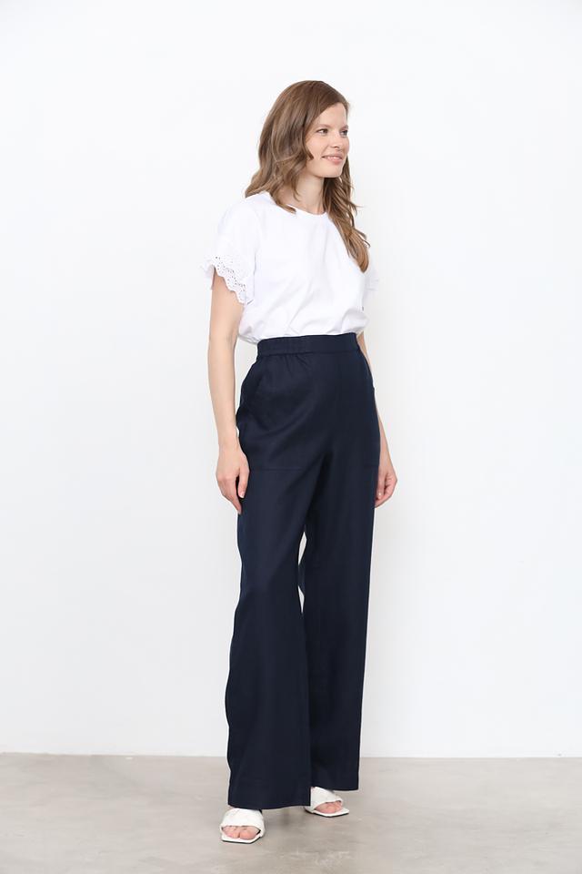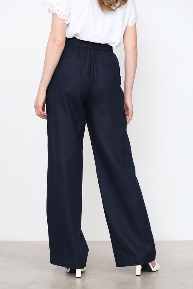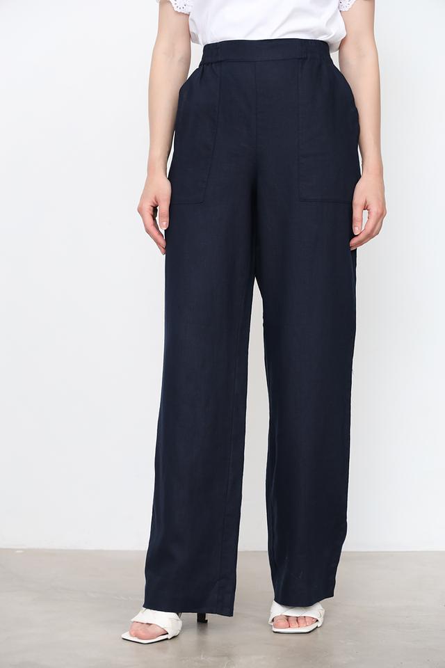 Женские брюки палаццо от Oui тёмно-синего цвета, выполнены из 100% льна. Модель с эластичным поясом и боковыми карманами отличается свободным кроем и комфортом в носке. Состав: лен 100%