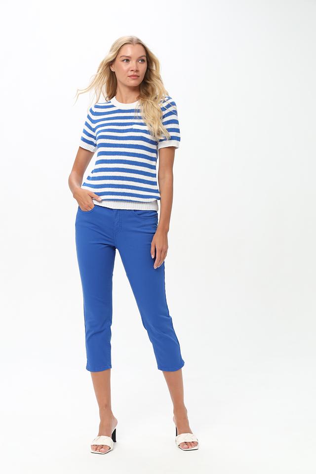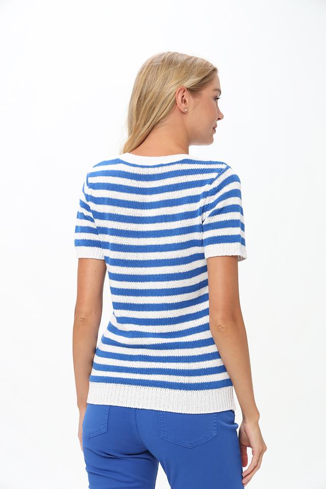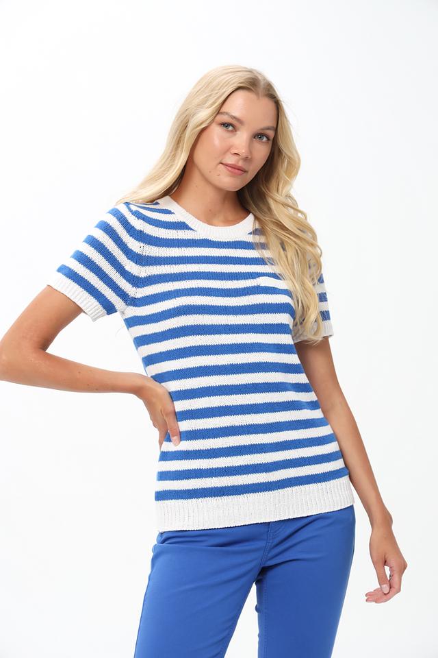 Женский пуловер Oui синего и белого цвета с коротким рукавом выполнен в классической полосатой расцветке. Модель из 100% хлопка обеспечит комфорт и удобство в повседневной носке. Состав: хлопок 100%
