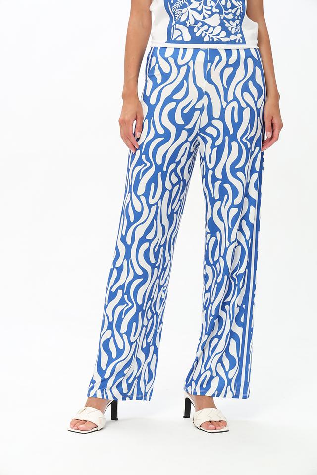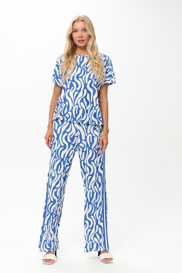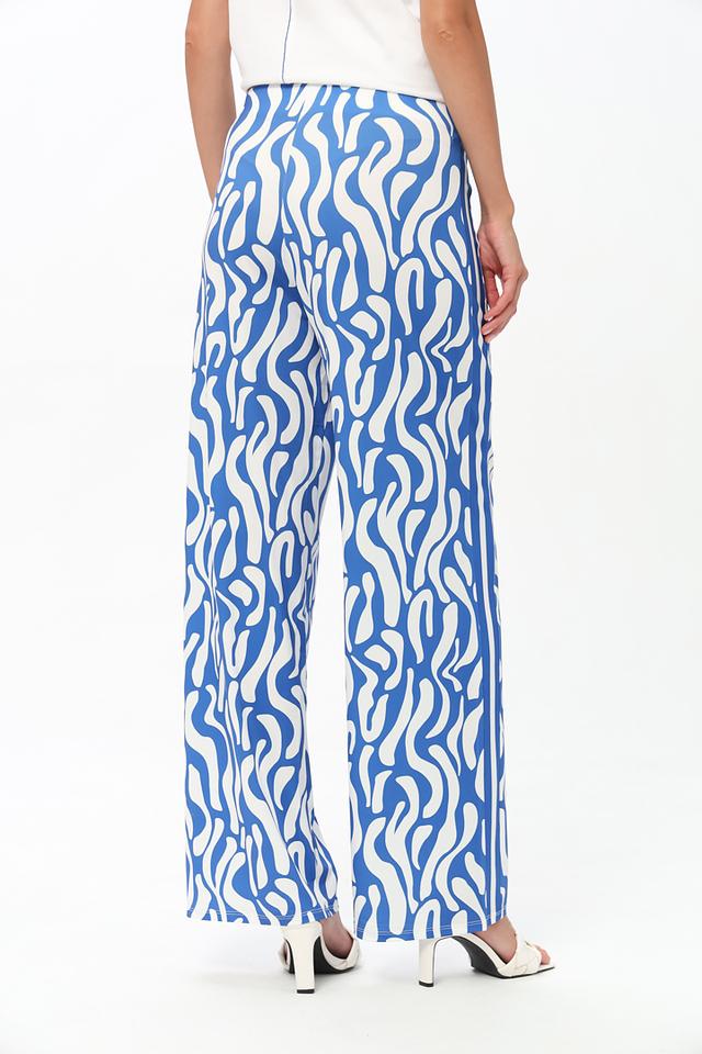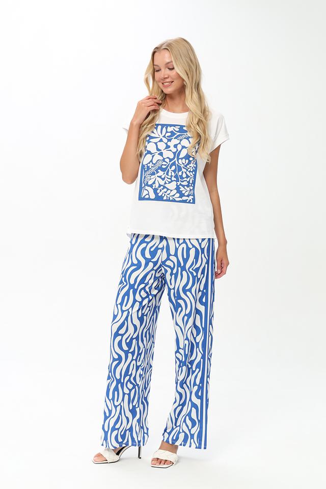Брюки имеют прямой крой и стандартную посадку по талии. Главная особенность – эффектный волнистый принт в синих и белых тонах, который придаёт изделию динамичный и современный вид.