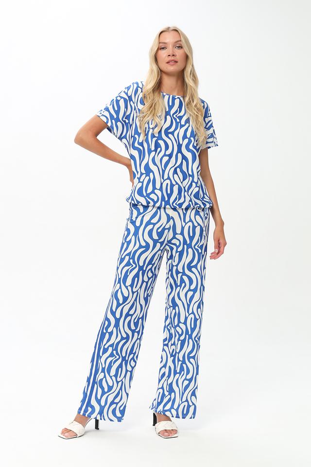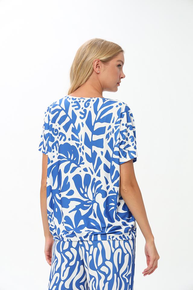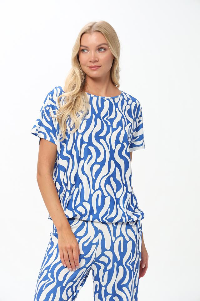 Блуза имеет свободный крой, короткие рукава и округлый вырез горловины. Главной особенностью модели является яркий и необычный волнистый принт в голубых и белых тонах, который придаёт ей оригинальность и привлекательность.