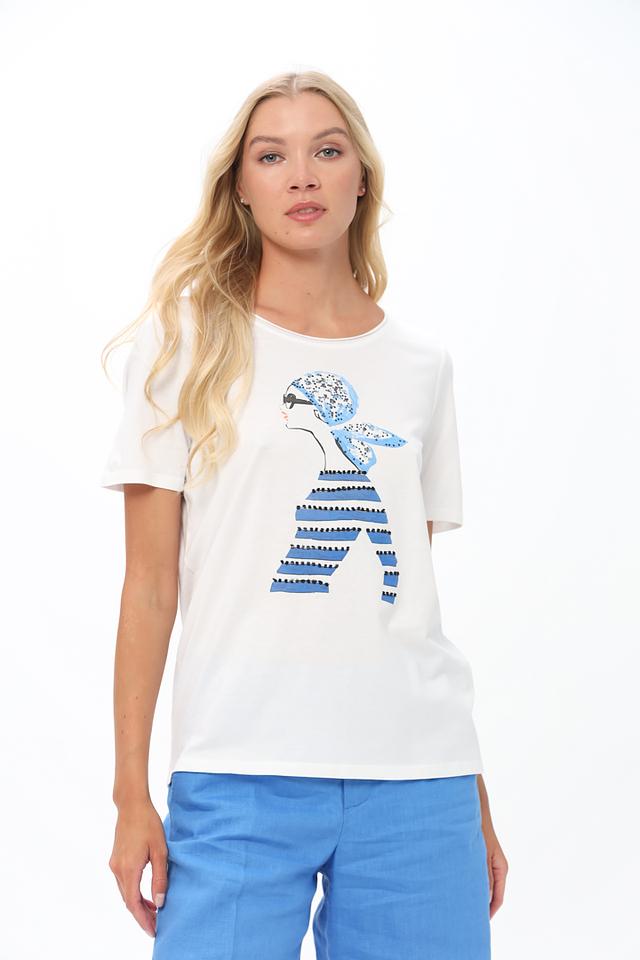 Особенностью данной модели является яркий принт в голубых тонах, изображающий стилизованную женскую фигуру. Этот принт добавляет футболке оригинальности и индивидуальности.
