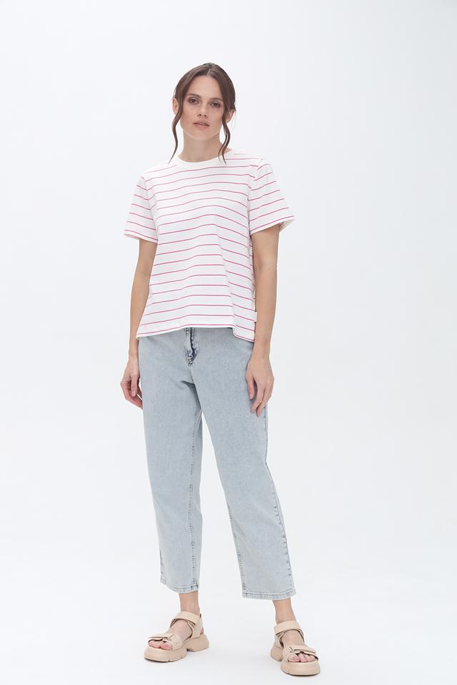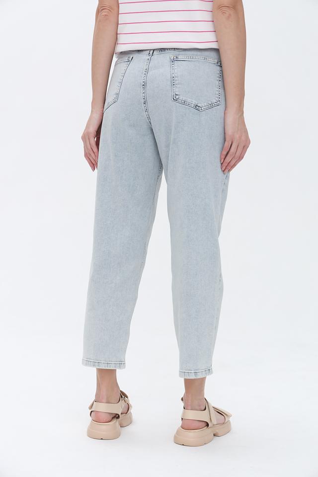 Джинсы имеют голубой цвет с эффектом потертости, что придает им стильный и непринужденный вид. Классический крой mom fit подчеркивает фигуру, а слегка укороченная длина делает их идеальными для ношения с кедами или ботинками.