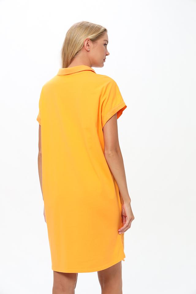 Платье имеет прямой крой, воротник-поло с застежкой на пуговицы и короткие рукава. Боковые карманы добавляют практичности, а небольшой разрез спереди обеспечивает свободу движений. Длина платья – до колена.